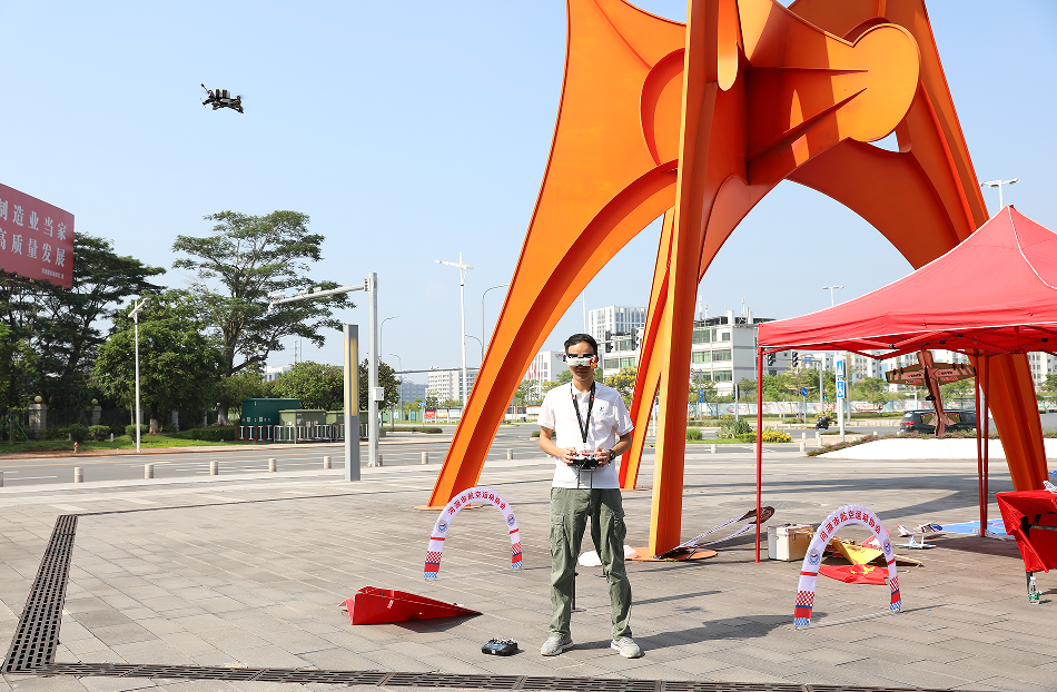 启动仪式结束后,河源市航空运动协会带来了航模飞行表演。操作员在现场进行遥控纸飞机、竞速无人机、3D固定翼模型飞机等空中表演。纸飞机结构简单,可以让学生们了解到飞行原理、无线电遥控、气象等有关知识,操作航空模型可以锻炼学生动手动脑能力。飞行员佩戴FPV眼镜,使用遥控器操控飞行器穿越各种障碍物,竞速无人机最高速度可达200公里每小时,从0到100公里每小时的加速用时不到2秒,无人机瞬间加速发出“嘶吼”的声音。有着“空中街舞”之称的3D固定翼模型飞机,在空中做出悬停、骤降、翻滚、摇晃等一系列高难度动作。