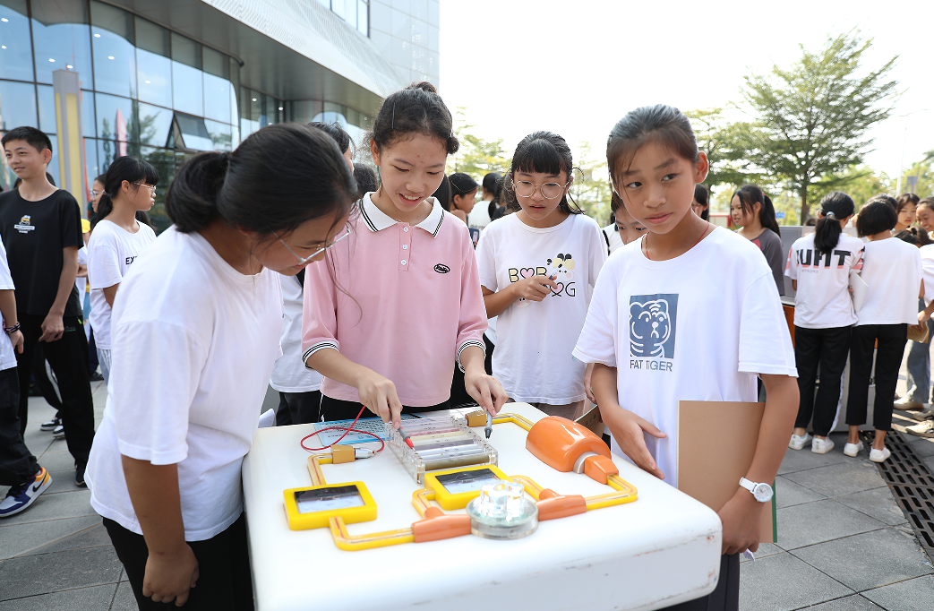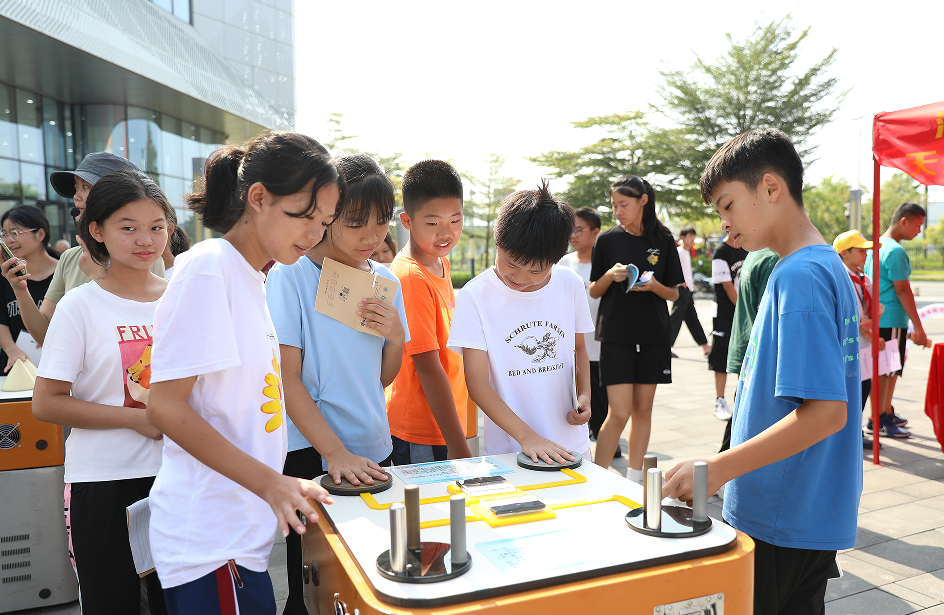市科技馆提供了科普器材,由专业技术人员进行科技展示和讲解,让学生们亲身体验,从而增强对科技的兴趣。学生们在科技互动体验区玩起了各种科学实验游戏。