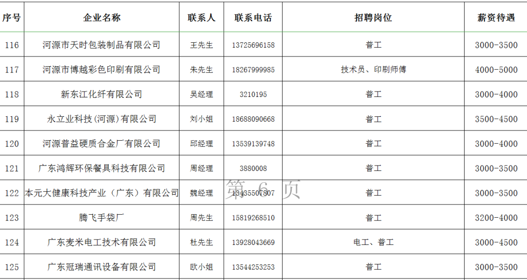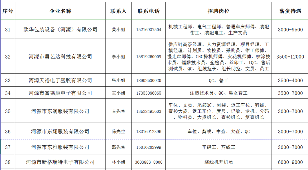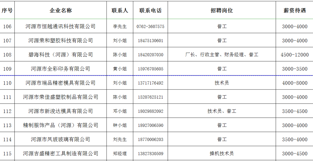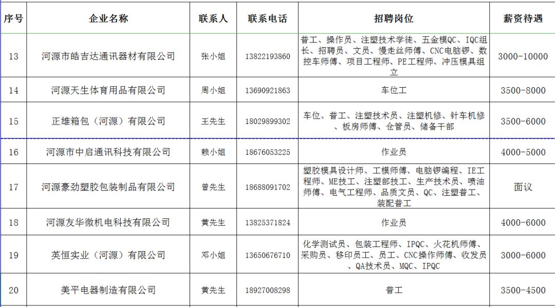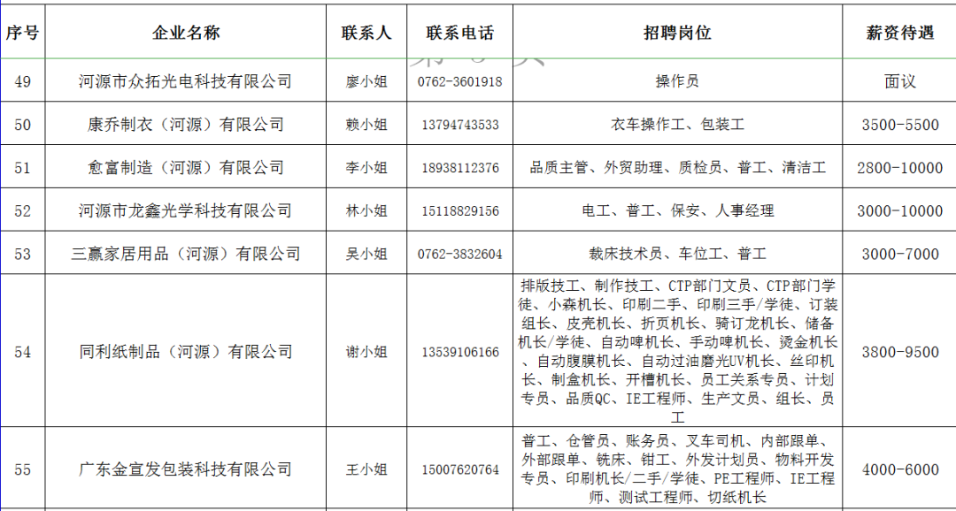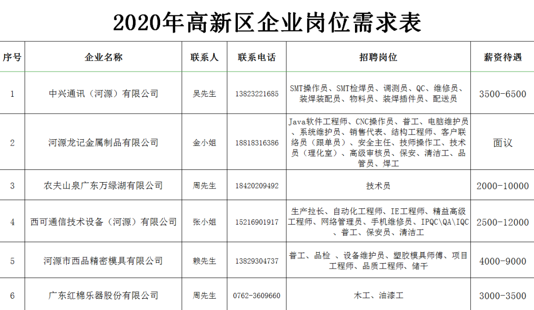 目前,河源高新区众多企业向广大求职对象抛出橄榄枝:提供岗位18000个;开出较高的月薪水平:中兴通讯3500-6000元,西可通信2500-12000元,农夫山泉4000-8000元,中启通讯4000-7000元,河源合隆制衣3000-12000元等,不一而足。
