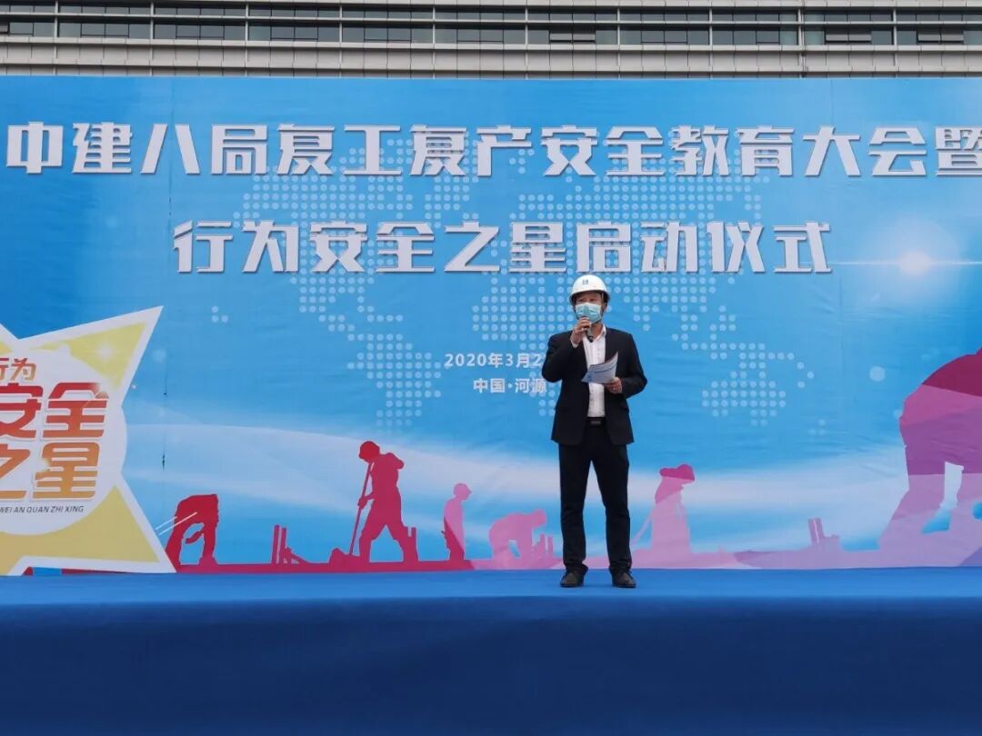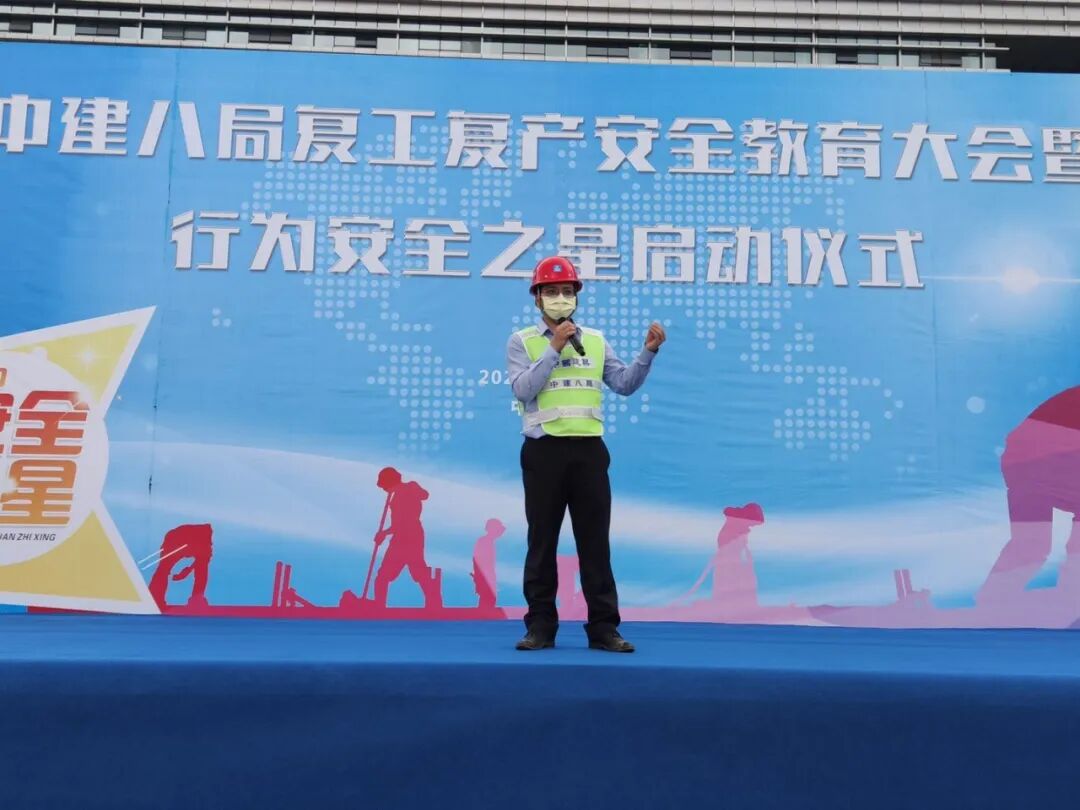21日下午,中建八局河源项目部举办了“复工复产安全教育大会暨行为安全之星启动仪式”,对1400名施工人员进行复工复产安全教育。