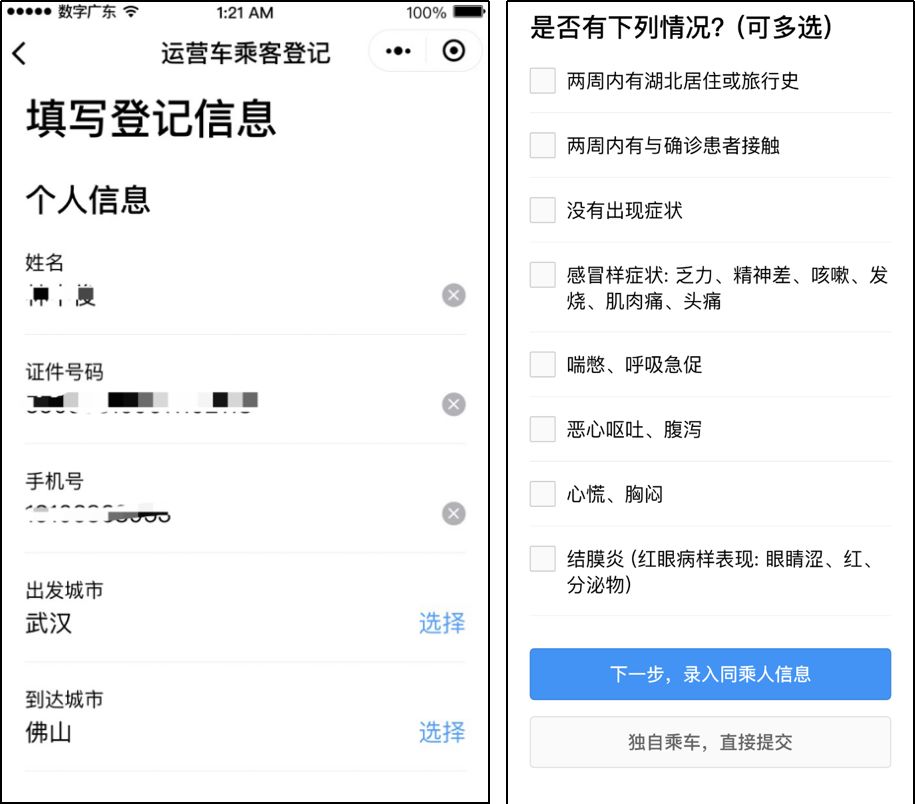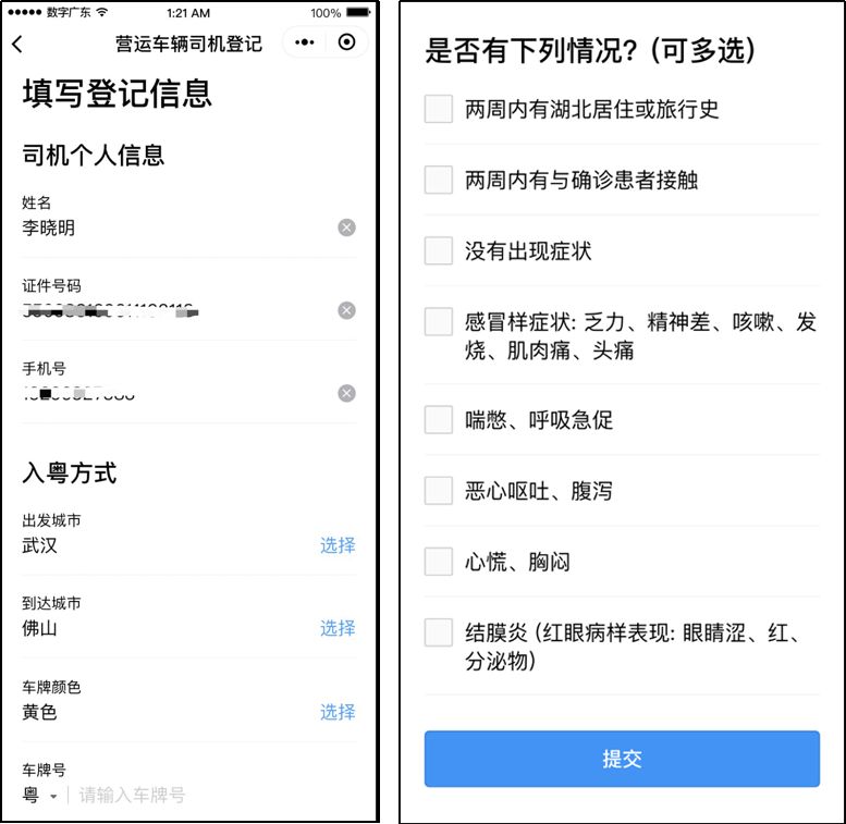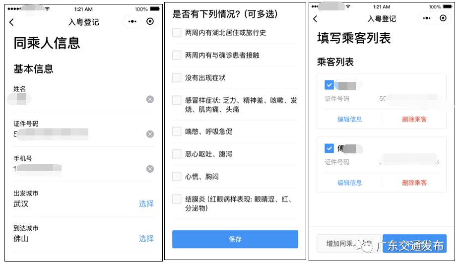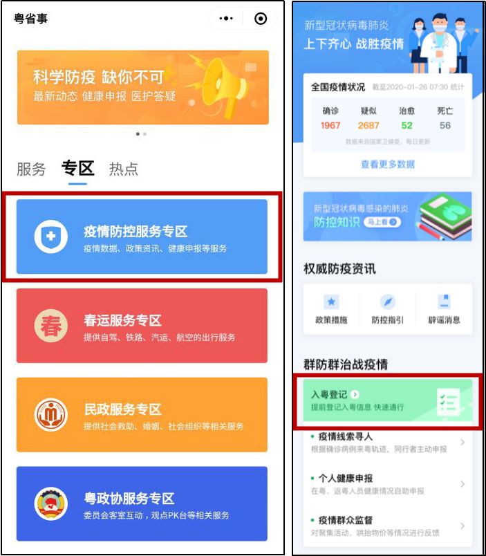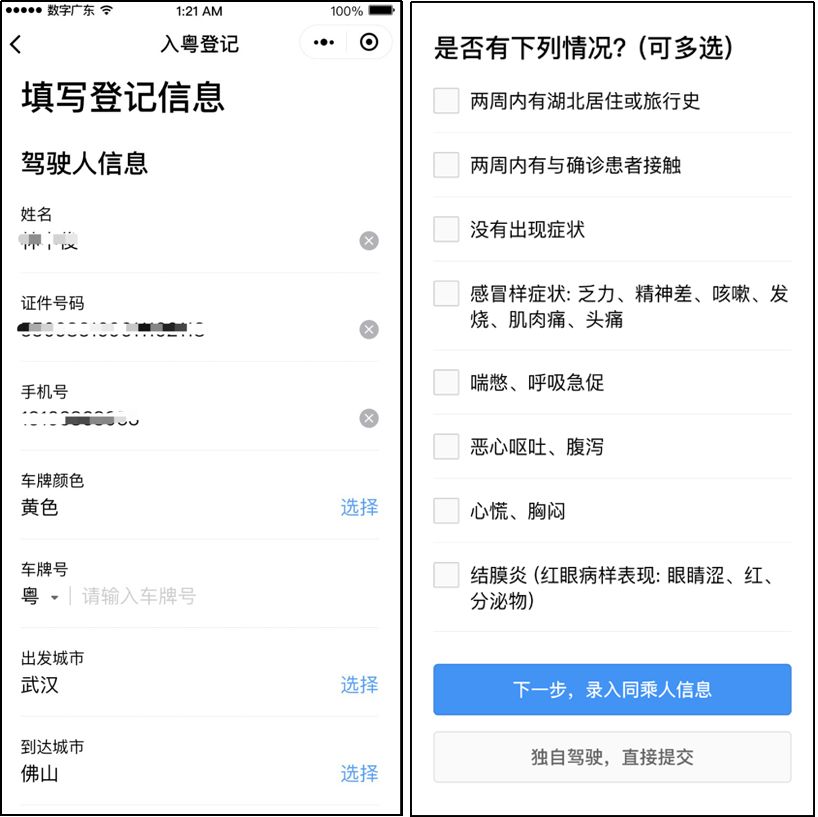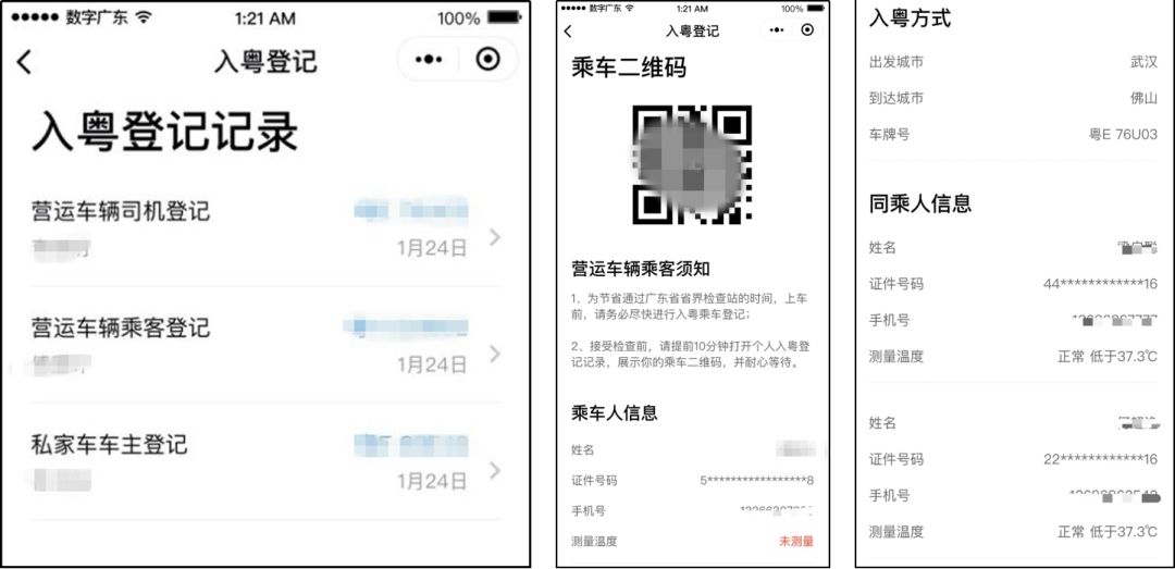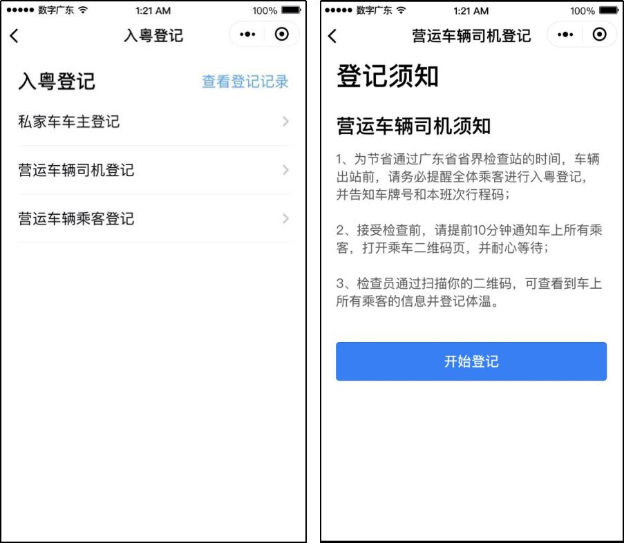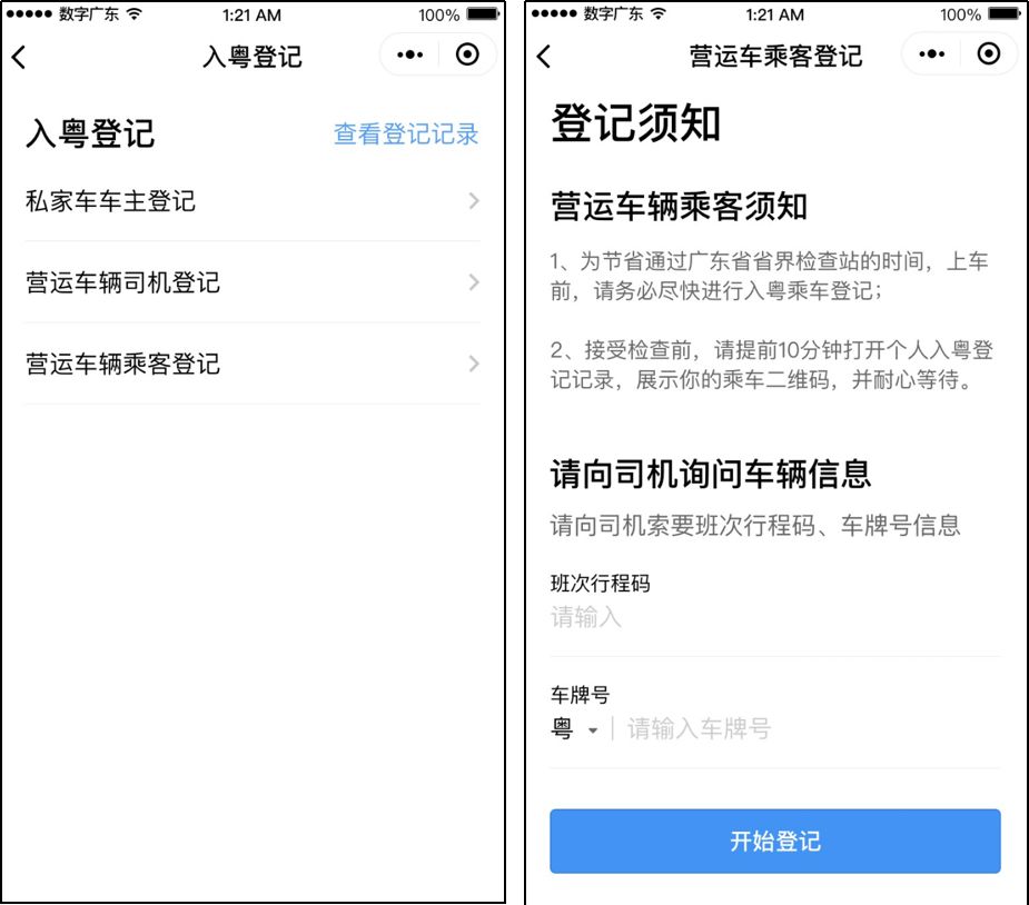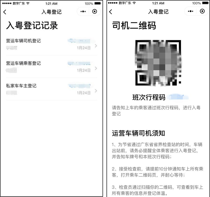 为了做好疫情防控和交通保畅顺工作,按照省委、省政府和疫情防控指挥部部署,广东省交通运输厅、广东省政务服务数据管理局和数字广东公司锐意创新,充分利用“数字化”手段,推出了“入粤登记”服务产品。2月3日,“入粤登记”正式入驻“粤省事”小程序,进广东车辆可通过“入粤登记”一键办理信息登记。 完成“入粤登记”登记后,车主凭借生成的专用“二维码”,在经过各大联合检疫站时,可快速“扫码”完成信息登记,既减少现场登记时间,加快检测速度,又减少了现场检测登记时的接触,降低因接触感染进一步传播疫情的概率。同时,“入粤登记”还大大降低了基层一线检疫人员的工作强度,检疫站也可根据登记信息预测来车人员,合理安排检疫人员,为高效做好疫情防控工作提供有力的保障。 为了做好新型冠状病毒感染的肺炎疫情防控工作,广东已在韶关、清远、河源、梅州、湛江、茂名、肇庆、潮州、云浮等9个地市19个省界高速公路设立联合检疫站,建立入粤车辆登记制度,切实加强疫情入口防控。 车主进入“粤省事”小程序后,可在“疫情防控服务专区”中找到“入粤登记”应用服务,首次启动需进行实名认证。自驾车主、营运车辆司机和营运车辆乘客在出行前均需要在“入粤登记”中登记车牌号、出发地、目的地、是否具有湖北居住或旅行史、身体状况等信息。其中,自驾车司机负责统一登记车辆信息和乘客的信息;营运车辆司机需协助提供班车行程码及车牌号信息给乘客各自在“粤省事”上进行登记。完成信息登记后,“入粤登记”应用服务会生成一个“二维码”,车辆经过各大联合检疫站时,司机或乘客只需要出示“二维码”,检查员扫码确认,并完成司机和乘客的体温检测、数据上报后,车辆可快速通过检疫站。 省交通运输厅呼吁,春节后返程高峰即将到来,为打赢疫情防控阻击战,保障广大人民平安畅顺出行,请出发前或入粤前完成入粤登记,以便快速通过各大联合检疫站。 “入粤登记”如何操作 马上带你看看 如图:扫描下方二维码,或依次进入“疫情防控服务专区”入口——“入粤登记”入口,实名认证登录办理: “粤省事”微信小程序 实名认证注册/登录流程 进入对应服务后,如提示“本次操作需要您进行登录验证”,点击“确定”,并根据界面相应提示实名认证,首次登录请按照提示绑定手机号码(已注册用户略过此步)。 阅读,点击同意事项,并点击“开始登录”。 绑定手机号后,点击“同意授权”,进入下一步。 输入微信支付密码,完成登录,如无法登录,请确认是否为本人登录及绑定本人的银行卡。(微信支付通过公安部、银行等权威机构认证,是快速完成实名认证的技术保障,仅作身份数据识别,不会造成任何扣费行为。) 自驾用户群体 (含同乘用户) 驾驶员:在粤省事实名认证后,登记车牌号、出发地目的地,勾选是否途经湖北,并添加乘车人(姓名、身份证)的部分或者全部信息。 进入“入粤登记”,选择“私家车车主登记”。 填写驾驶人信息,如独自驾驶,确认无误后可直接提交。 如有同行乘客:由驾驶员点击“下一步,录入同乘人信息”,统一添加填写同行乘客相关信息,可添加多位乘客信息。 到达检查站,驾驶员在“粤省事”的“入粤登记记录”找到对应记录,出示对应乘车二维码,检查员扫码核验,待检查员测量全车人员体温、提交信息后通过。 如图:出示二维码界面 中巴、大巴客车等营运交通工具的 驾驶员群体 驾驶员在“粤省事”实名验证登录后,选择“入粤登记”——“营运车辆司机登记”,并填写登记信息,确认无误后可提交。 如图:入粤登记界面 个人信息填写界面 驾驶员在“粤省事”首页“疫情防控服务专区”进入“入粤登记”服务,点击右上角“查看记录”找到对应记录,点击相应车牌,出示对应司机二维码给检查员核验,待检查员测量体温、提交信息后通过。另如有乘客询问班次行程码也可从此进入获取。 如图:入粤登记记录 司机二维码 乘坐中巴、大巴客车等 营运交通工具的 乘客群体 乘客在“粤省事”实名验证登录后,选择“入粤登记”——“营运车辆乘客登记”,向司机索取行程码及车牌号,填入后,再填写登记信息,确认无误后可提交。或者由同车人员代为登记。 如图:入粤登记界面 车辆信息填写界面 个人信息填写界面 乘客在“粤省事”的“疫情防控服务专区”进入“入粤登记”服务,点击右上角“查看记录”找到对应记录,点击当次乘坐的对应车牌,出示对应乘车二维码给检查员核验,待检查员测量体温、提交信息后通过。 如图:入粤登记记录 乘车二维码 最后 在登记中有什么疑问 都可以看过来 如何找到“粤省事”小程序,并进入办理入粤登记服务?? 用户(除检测员群体)可在微信搜索界面,搜索“粤省事小程序”,选择进入主界面,并下滑至“专区”——“疫情防控服务专区”——“入粤登记”,使用微信支付密码实名登录后(需为本人登录及绑定本人银行卡),根据界面提示进行办理。 支持哪些人士办理,有无户籍、城市等限制? 支持持有有效二代居民身份证的用户实名认证后办理,无城市、户籍限制,暂不支持港澳、台湾人士及外籍人士办理,因此如遇婴幼儿乘客、港澳人士、台湾人士、外籍人士等人群,敬请咨询检查员其他处理方法。 是否支持代办? 当前检查员、营运车辆司机及乘客、私家车