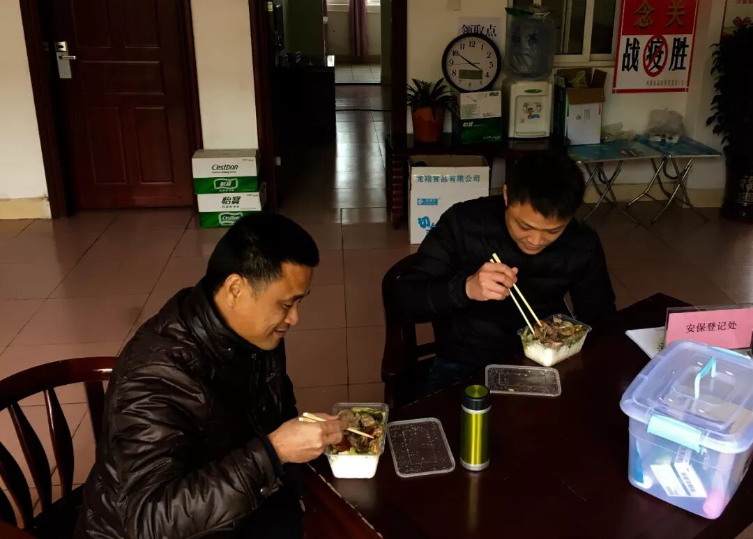 赖晓程在隔离区加班工作,与工作人员吃快餐