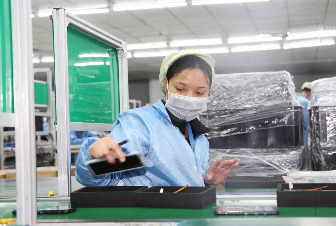 在美晨通讯的组装车间,生产线上的员工比正常少了一半,每个人之间空着一个工位,这是为了疫情防控安全作出的举措,但生产还在有序进行。300多位河源籍员工返回岗位,有条不紊地开展工作,生产的是出口国外的手机成品,这是年前排好的订单,要弥补之前延工的时间,按时给客户交货。
