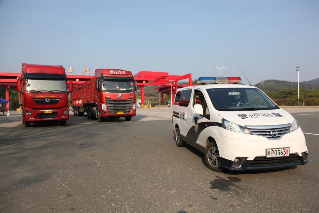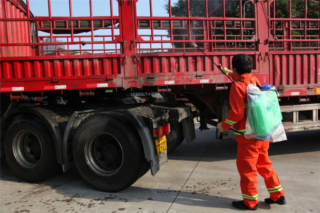 ▲在粤赣高速河源市区出口,工作人员对货车进行全方位消杀