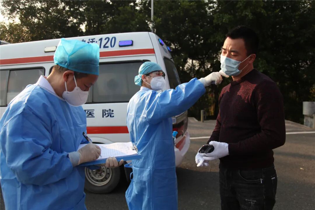 8时20分,两辆大货车从粤赣高速河源市区出口下高速。同济医院的医护人员上前为3名司乘人员测量体温,询问他们的身体健康状态,并登记姓名等信息。