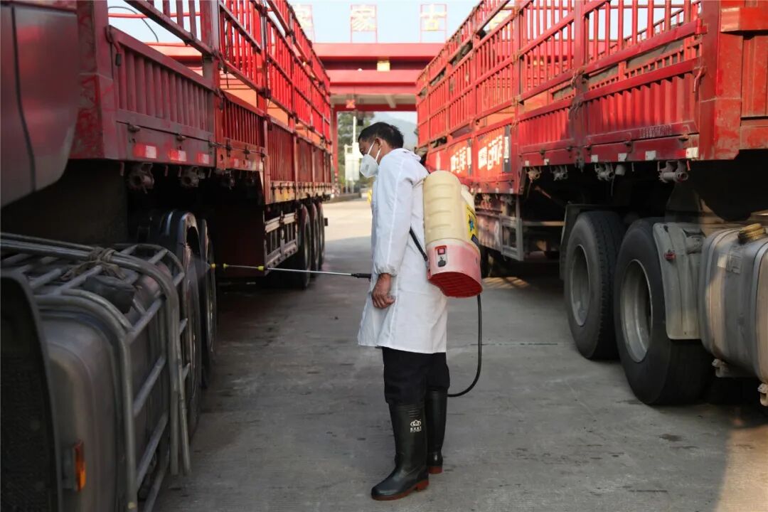 ▲货车抵达峰德机械公司后,再次进行全面消杀。