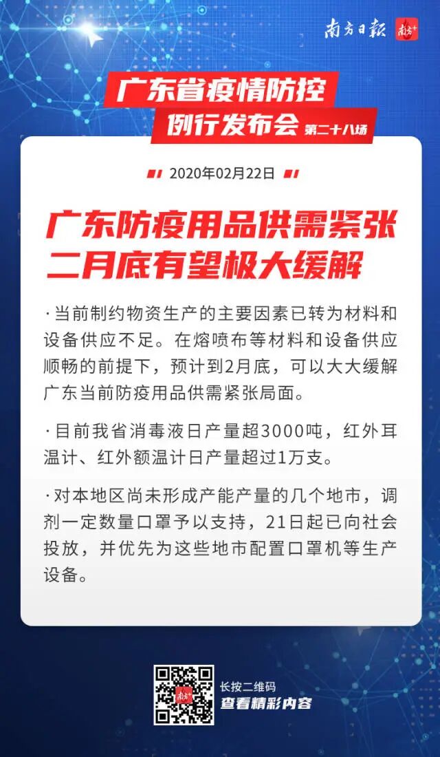 杨鹏飞介绍,对于防护物资紧缺的问题,我省已迅速采取了一系列举措。推动已经取得生产资质、具备生产条件的企业迅速达产扩产;帮助具备生产条件,但未取得资质的企业尽快获得生产资质,提高产品质量;推动卫生用品、服装服饰等有加工条件的企业转产,或与有资质的生产企业合作,发挥缝纫加工等方面的产能优势。 当前,制约物资生产的主要因素已转为材料和设备供应不足。杨鹏飞举例,广东省熔喷布的产能还是相对有限。有关部门通过协同组织,努力保障好对生产企业的供应。在熔喷布等材料和设备供应顺畅的前提下,预计到2月底,可以大大缓解当前防疫用品供需紧张的局面。 在消毒液、红外耳温计、红外额温计等用品方面,目前,我省消毒液日产量超过3000吨,红外耳温计、红外额温计日产量超过1万支。一直以来,省市场监管局、药监局持续加强各类防疫用品市场价格和产品质量监测监管,总体上看,市场供应基本稳定。 与此同时,压实属地责任,“一企一策”防控到位。要求各地区加大保障力度,“一企一策”指导督促企业制定切实可行、行之有效的疫情防控措施,有效解决企业落实口罩、消毒用品、测温设备、隔离场所等问题,在做好疫情防控的前提下分批让更多企业复工复产。对各地区制造业重点企业、重大项目复工复产、开工建设所需的防疫用品,省工信厅也将加大统筹力度,予以重点支持。 广东还支持部分地区加大口罩等防疫用品的市场投放。省疫情防控指挥部物资保障一组会同省市场监管局,及时监测各地市口罩市场供需情况。对本地区尚未形成产能产量的几个地市,调剂一定数量的口罩予以支持,21日起已向社会投放;同时优先为这些地市配置口罩机等生产设备,帮助其形成生产能力,加大供应。 对于已经定期投放的地市,要求逐步加大投放数量,改善市场预期。 杨鹏飞也提倡,在使用口罩方面,科学使用、规范使用、合理使用,针对不同的场合及防护的需要做到按需使用、按功能使用,避免过度使用和不当使用,节约口罩资源。