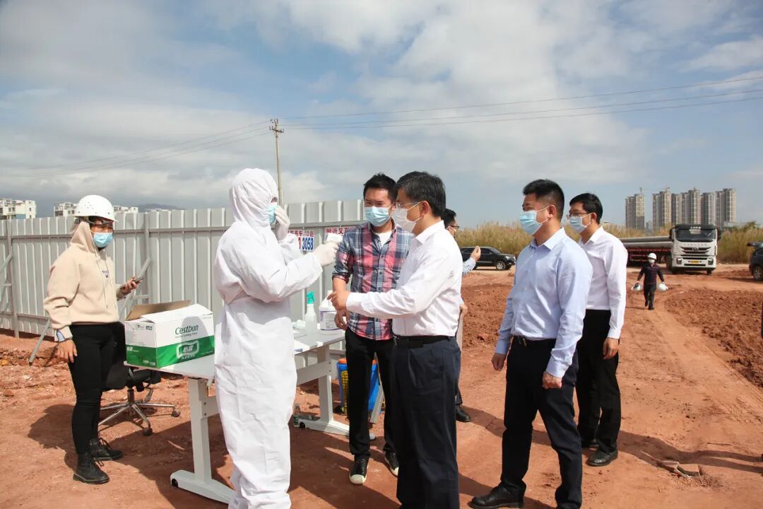 在河源市高新区基础设施工程及配套项目的4个子项目工地上,工人正在忙碌地施工,晚上7点多,中央活力区景观工程项目现场仍有挖机在作业。南山产业园、红苹果家具等重点产业项目的工地上,挖掘机、打桩机等机器轰鸣。在外出作业前,工人们要检测体温、佩戴口罩,他们的宿舍也会进行全方位消杀,实现防疫、生产两不误。