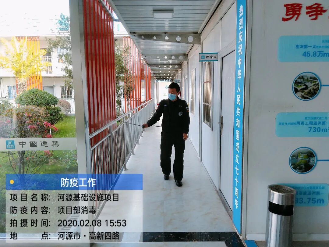 中建八局河源项目部市政执行经理刘志常介绍,在疫情防控方面,项目部建立疫情防控领导小组和工作小组,安排疫情防控专员对班组工人进行专人管理。每个项目工地门口均配备电子体温枪、一次性医用口罩、免洗手消毒液、84消毒水、喷雾器等防护用品,对到岗人员严格落实体温监测,每日对办公区生活区、施工现场等场所进行清洁消毒。