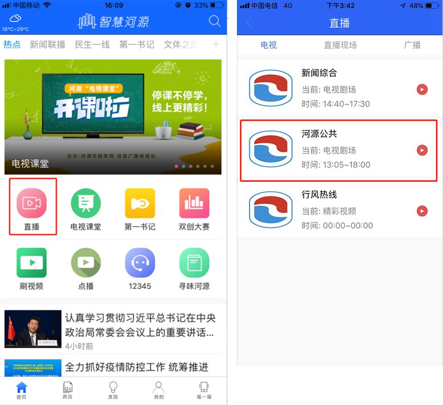 根据播出安排表,在相应时间内打开“智慧河源”APP,进入首页“直播”模块,点击进入后选择“河源公共”频道,即可与电视节目同步收看。