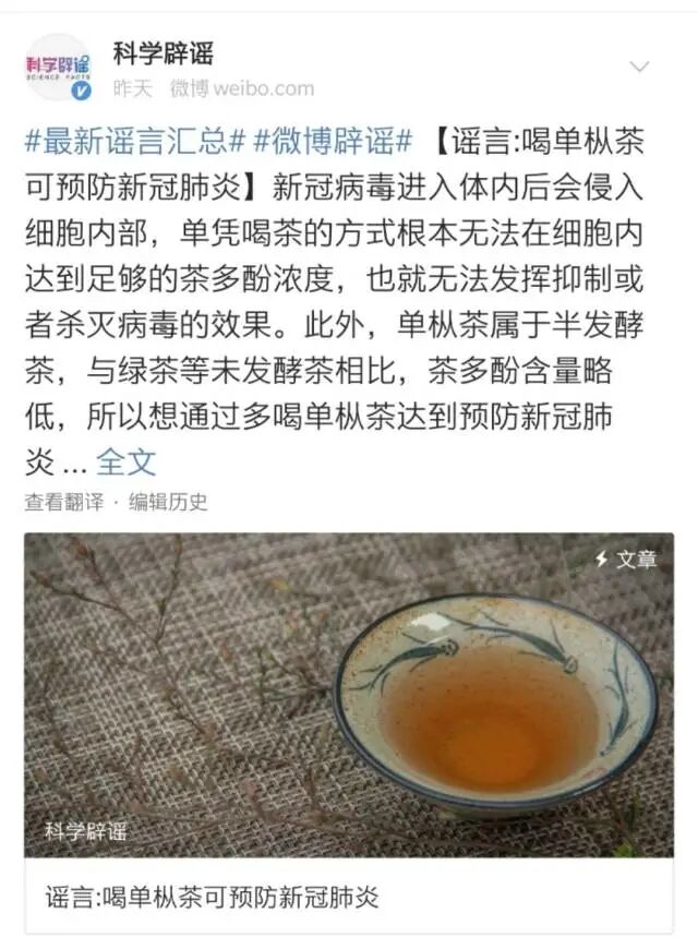 据了解,网络流传的“钟南山发布多喝单枞茶对防止肺炎有重大效果”的截图是假的。但还是会有很多人疑惑,单枞茶究竟是否具有抑制或者杀灭新冠肺炎的能力呢?可以非常肯定地告诉您,喝单枞茶不能预防新冠肺炎。 单枞是一种氧化程度较深的乌龙茶,氧化程度比绿茶和白茶深,但不如红茶完全。各种茶中的化学成分种类差别不大,只是相对含量不同。 在一些细胞实验和动物实验中,茶的提取物显示了一定的“生理功能”,包括抑制病毒和抗氧化等等,但这样的实验结果不能演绎扩展成人喝茶就有同样的功效。即便是这些细胞实验和动物实验中的作用,也跟“预防新冠肺炎”没有什么关系。