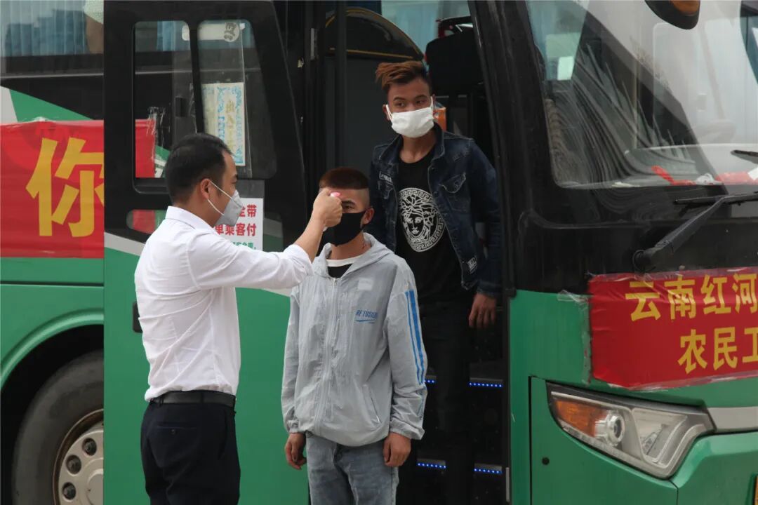 从村口到厂门口,河源高新区这趟专车接回云南省红河哈尼族彝族自治州元阳县的45名民工,被西可通信技术设备(河源)有限公司(以下简称“西可通信”)接回厂区。这批人有的是西可通信的老员工,有的是被老员工宣传动员过来的新员工。他们出发前经过所在地县乡两级健康检查,随身携带健康证明。