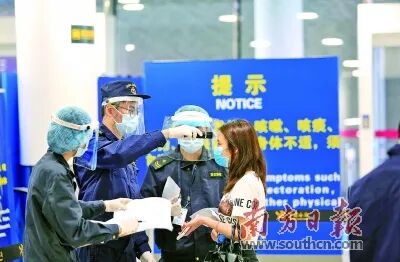 3月16日,深圳机场入境旅客填写健康申明卡后接受海关人员的体温检测。南方日报记者 鲁力 摄