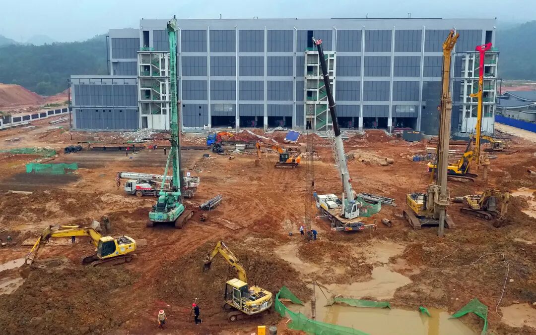 ▲河源高新区模具城统建厂房项目建设工地,工人们正在加紧施工。