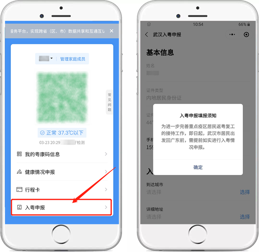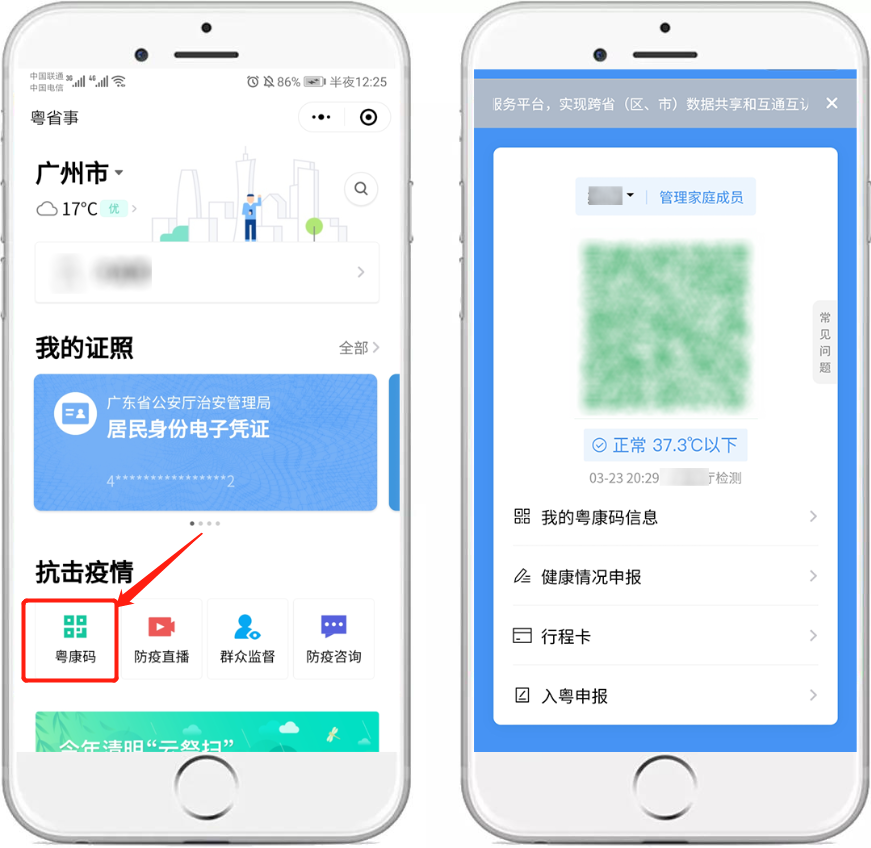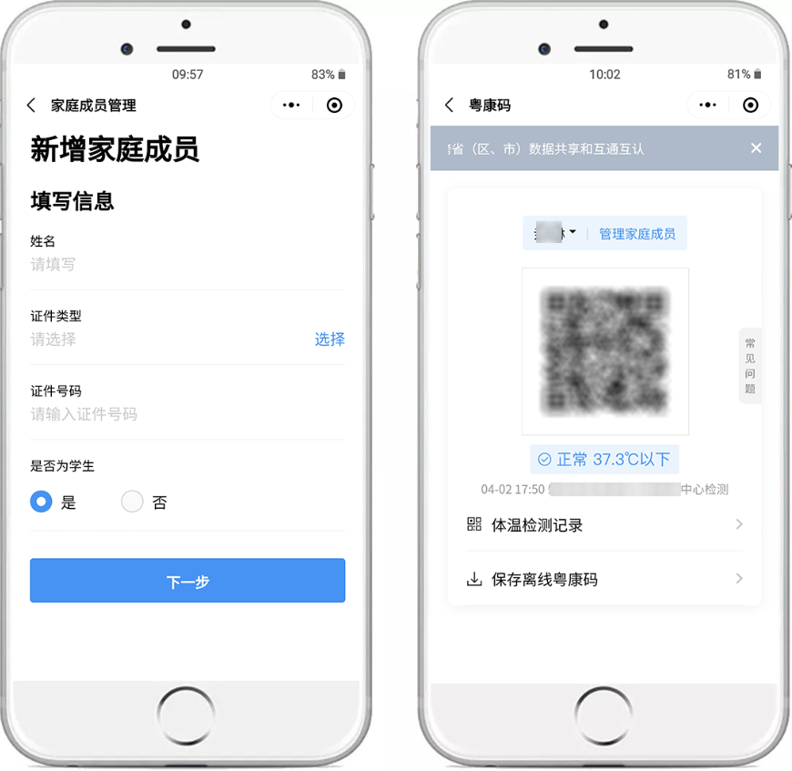 “粤康码” 全国一体化平台“防疫健康信息码” 广东全省均可一码通行 本文还附“粤康码”常见疑问解答 记得耐心看到最后哦~ “粤康码”依托全国一体化政务服务平台,与国家“防疫健康信息码”、各省(区、市)健康通行码相关防疫健康信息实现了数据共享互信。 “粤康码”分为“红、绿码”,疫情防控重点人群标识为“红码”,“绿码”可全省通行。 【外省人员入粤要求】 外省人员入粤时,应提前申领全国一体化平台“防疫健康信息码”或“粤康码”作为广东省通行凭证,实现“一码通行”(全国一体化平台“防疫健康信息码”申领方式见文末)。 【武汉入粤申报】 现阶段武汉人员来粤,应提前注册登录粤省事,使用“粤康码”作为广东省内通行凭证,实现“一码通行”,并提前使用“入粤申报”登记目的地等基本信息。 “粤康码”入粤申报入口 填写基本信息和核酸检测情况完成申报。 上下滑动查看详细服务 点击下方图片进入领取“粤康码” 或微信搜索“粤省事”小程序,在首页从“粤康码”服务入口进入。 目前全国一体化平台“防疫健康信息码”和“粤康码”已建立信息互通互认机制和规则,明确了跨地区流动人员健康通行码信息的可信可用。 除北京、湖北等地外,若出现健康通行码无法互认的情况,可向本地相关管理部门或12345热线等反映。 持有中华人民共和国居民身份证的老人和小孩可通过已登录粤省事的用户代领“粤康码” 通过添加家庭成员功能 代申领“粤康码” 如家里有老人、小孩等不方便使用手机的人员,可点击粤康码上方的“添加家庭成员”,填入家庭成员的姓名与身份证号,并让其进行人脸识别认证。 如新增家庭成员为未成年人,用户可根据页面提示填写未成年人信息,在【是否为学生】选项中填【是】,并协助未成年人进入人脸识别认证环节; 如提示人脸识别失败,将提示获得未完成实人认证的粤康码,此时可返回至“粤康码”界面,并切换姓名,获取白底“粤康码”,该“粤康码”也可进行扫码核验,同时支持保存离线“粤康码”(当前暂不支持跨设备登录查询未实人认证未成年人的体温检测记录)。 没有身份证的老人或小孩应当可通过线下填报等方式申报健康状态供管理人员查询核验,各地不能以申领健康通行码作为唯一通行凭证。 持内地居民身份证和港澳居民来往内地通行证、中国公民普通护照入境人员,直接通过“粤省事”微信小程序获取本人“粤康码”;当前暂不支持外籍人士及台湾人士申领粤康码,建议此类入境人员可通过线下登记的方式办理。 Q:在申领“粤康码”时,发现数据信息有误该怎么办? 如果发现“粤康码”数据错误(如体温错误),不支持修改或删除; 个人健康申报近期居住地址点击如果没反应,开启小程序及手机系统定位授权即可解决; 查看健康申报记录,如发现登记信息有误,不支持修改,可重新申报提交; 个人健康申报有多条申报记录的,以最新的健康申报记录为准。 Q:在使用“粤康码”时,出现“系统繁忙,当前查询人数过多,请稍后再试”时怎么办? 由于同一时间查看、亮码人员较多,有可能会出现网络拥堵、暂时无法提供服务的情况,请耐心等待片刻,稍后再试即可。 “粤康码”服务也将根据实际需求不断对系统进行扩容升级,提升服务质量,全力保障“粤康码”服务稳定运行。 Q:公众申领健康通行码后,如何确保个人的健康信息数据不泄露? 健康通行码系统(包括“粤康码”)由政府部门负责建设,将严格按照国家法律法规保障数据安全,有严格的访问、使用权限控制及相关管理办法,严防数据泄露。 同时前端采集的数据进行了加密处理,对用户实人认证数据信息进行脱敏处理,以确保数据安全,在亮码扫码使用时,均需本人授权。 全国一体化平台“防疫健康信息码” 为支撑疫情精准防控和 有序复工复产工作 建议大家在跨省出行时 同时申领“粤康码”和 申领全国一体化平台 “防疫健康信息码” 目前,“粤康码”已实现 一码通行全广东