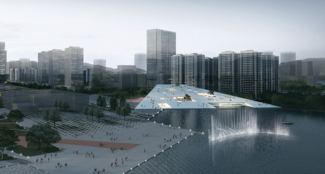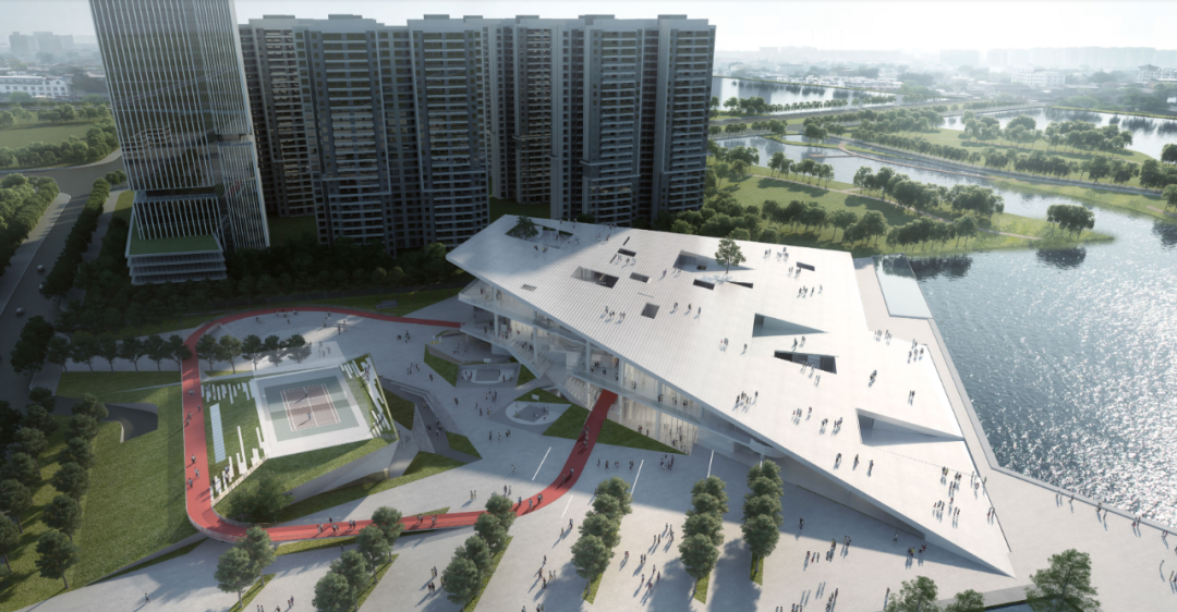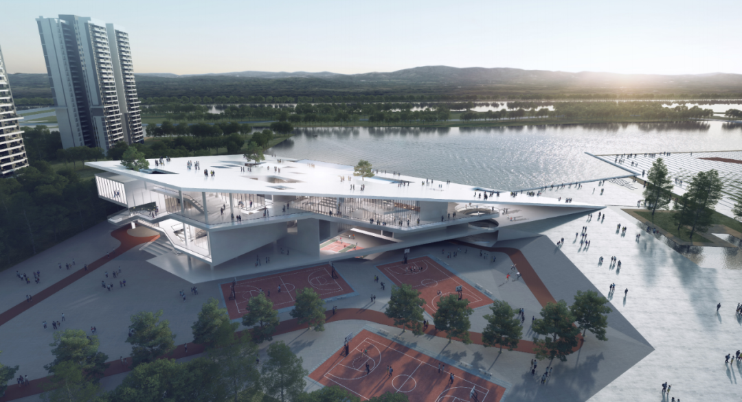 综合体育馆屋面为一个由地面向上延伸的大斜板上人屋面,屋面斜板在不同部门通过开洞与建筑内部各层连通,给市民提供一个休闲观光的公共平台。在建筑底部与水相接的地方,设计了一个与东江直接相连的无边际游泳池,提供仿佛畅游在东江的全新体验。