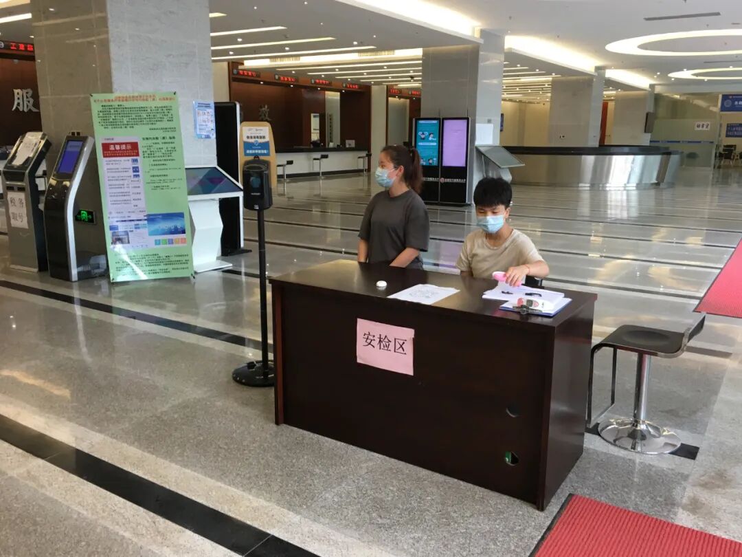 区政务服务数据管理局在大厅正门设立安检区,并配置红外体温检测仪、免洗消毒凝胶、一次性手套、含氯消毒剂(消毒粉、漂白粉等)、一次性医用口罩等防疫物资,有效确保物资充足,种类齐全。对来访办事群众进行实时体温监测并做好人员信息登记,如发现有发热等症状的,及时诊治并上报;每天不定期开展在岗工作人员体温检测,及时掌握健康信息动态。 三 加强大厅环境管理 每天定期或不定期开展大厅清洁与消毒工作,有效确保政务服务大厅地面、通风口、进出口等消毒无死角。