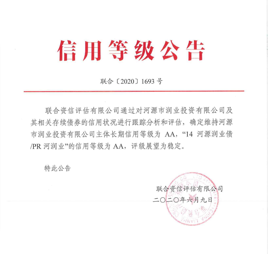 联合资信此次通过对宏观经济和政策环境、行业及河源市和高新区的经济环境、润业公司管理、经营、财务、存续债券偿还能力等方面进行综合评估分析后,确定维持润业公司主体长期信用等级为AA,“14 河源润业债/PR河润业”的信用等级为AA(AA含义:偿还债务的能力很强,受不利经济环境的影响不大,违约风险很低),评级展望为稳定(稳定含义:信用状况稳定,未来保持信用等级的可能性较大)。