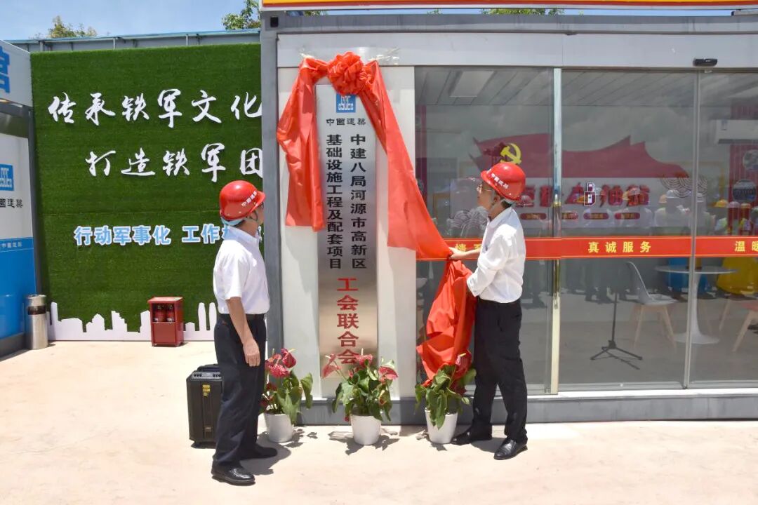▲朱小强与中建八局南方公司粤东分公司副经理邹翔共同为“工会联合会”揭牌