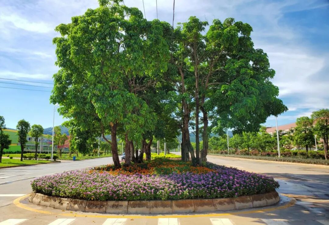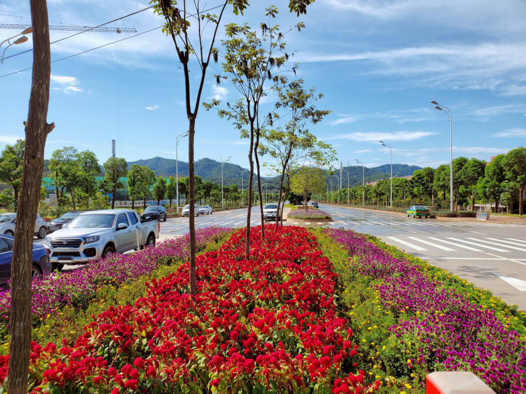 河源市高新技术开发区有限公司在深河产业城绿化带中间地区依次栽种赤壁红穗、香彩雀、孔雀草、长春花、龙船花、鸡冠花、千日红、马缨丹等时花,并根据土壤干旱程度,采用洒水车单独定期浇灌的方式,实施精细养护。