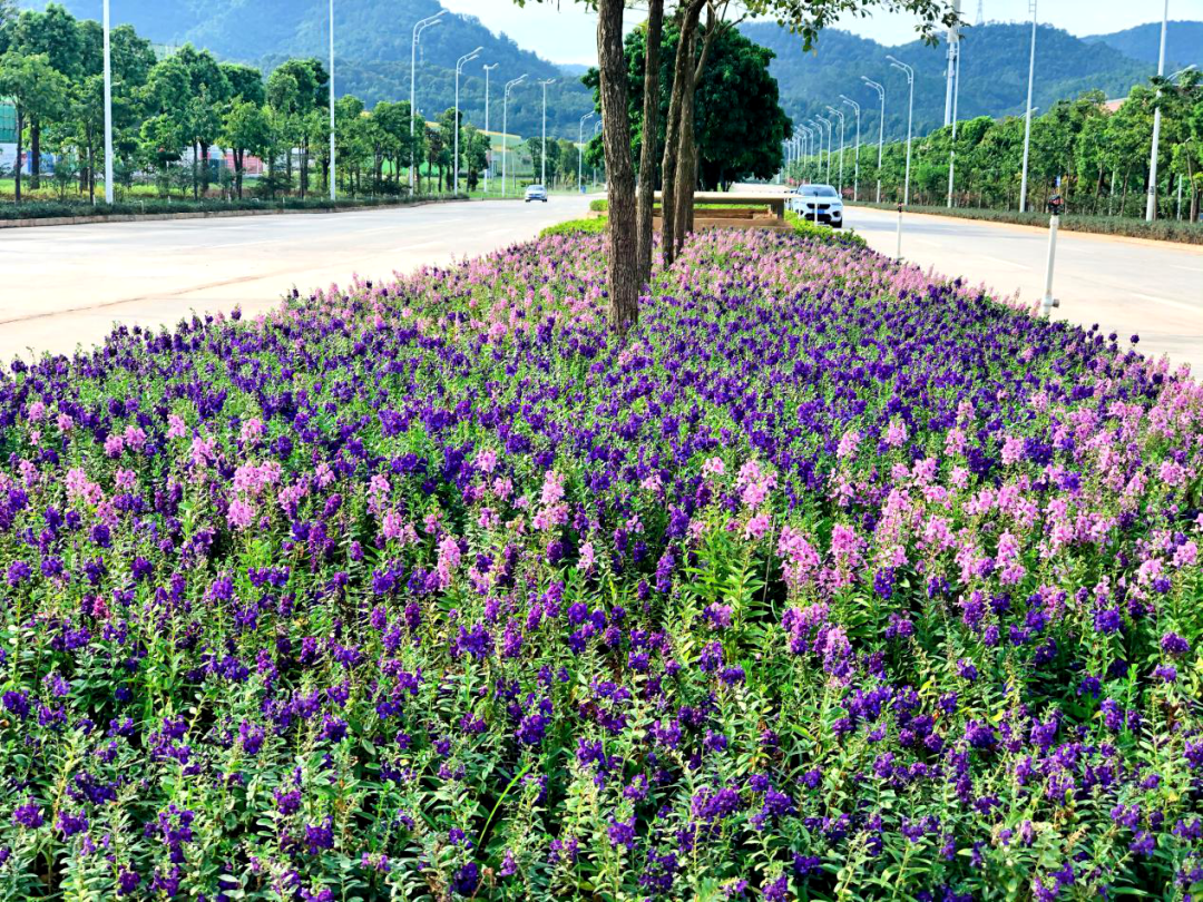 河源市高新技术开发区有限公司通过人工松土、清理杂物、平整场地备耕,在深河产业城周边道路非机动车道绿化带上栽植了金叶连翘、红花檵木、紫花芦莉、黄金叶等新绿篱;并在增加喷淋次数的同时,采用隐形雾喷的方式保障土壤湿度。