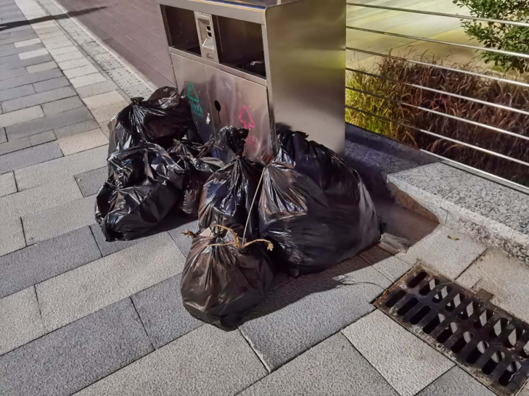 ▲志愿者将清理好的垃圾放在指定位置