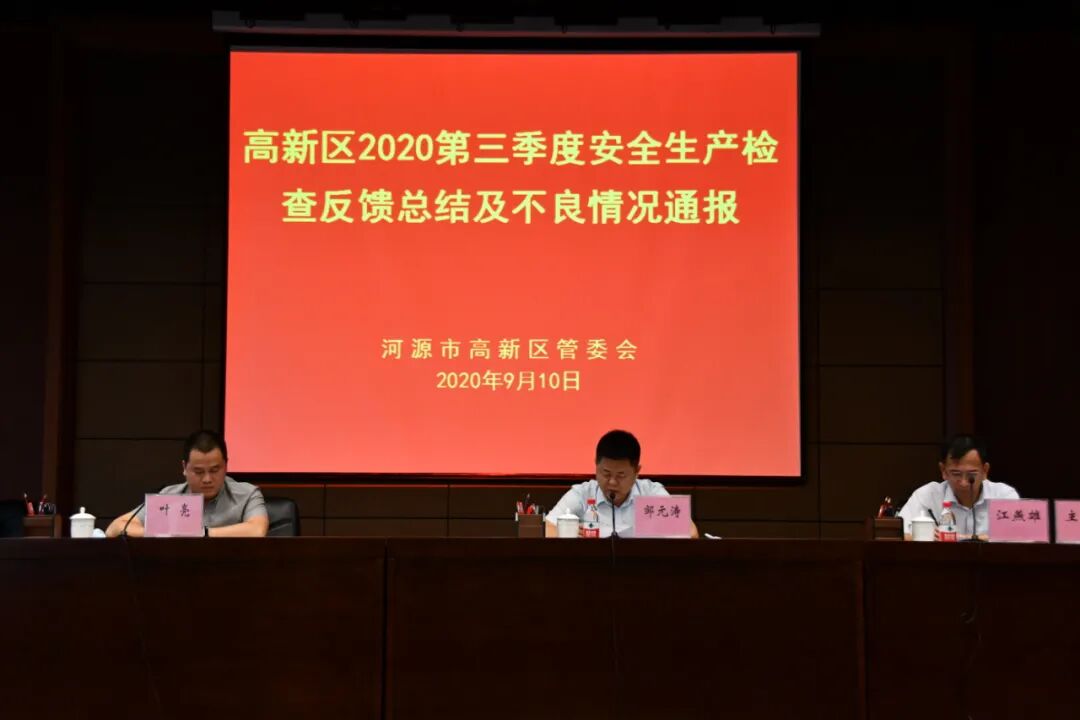 9月10日上午,河源高新区管委会召开2020年第三季度建筑施工安全生产检查反馈总结暨住建领域安全生产专项整治三年行动动员部署会议。河源高新区党工委委员、管委会副主任邹元涛参加会议并对专项整治三年行动作动员部署,辖区在建项目工程各方责任主体代表参加会议。