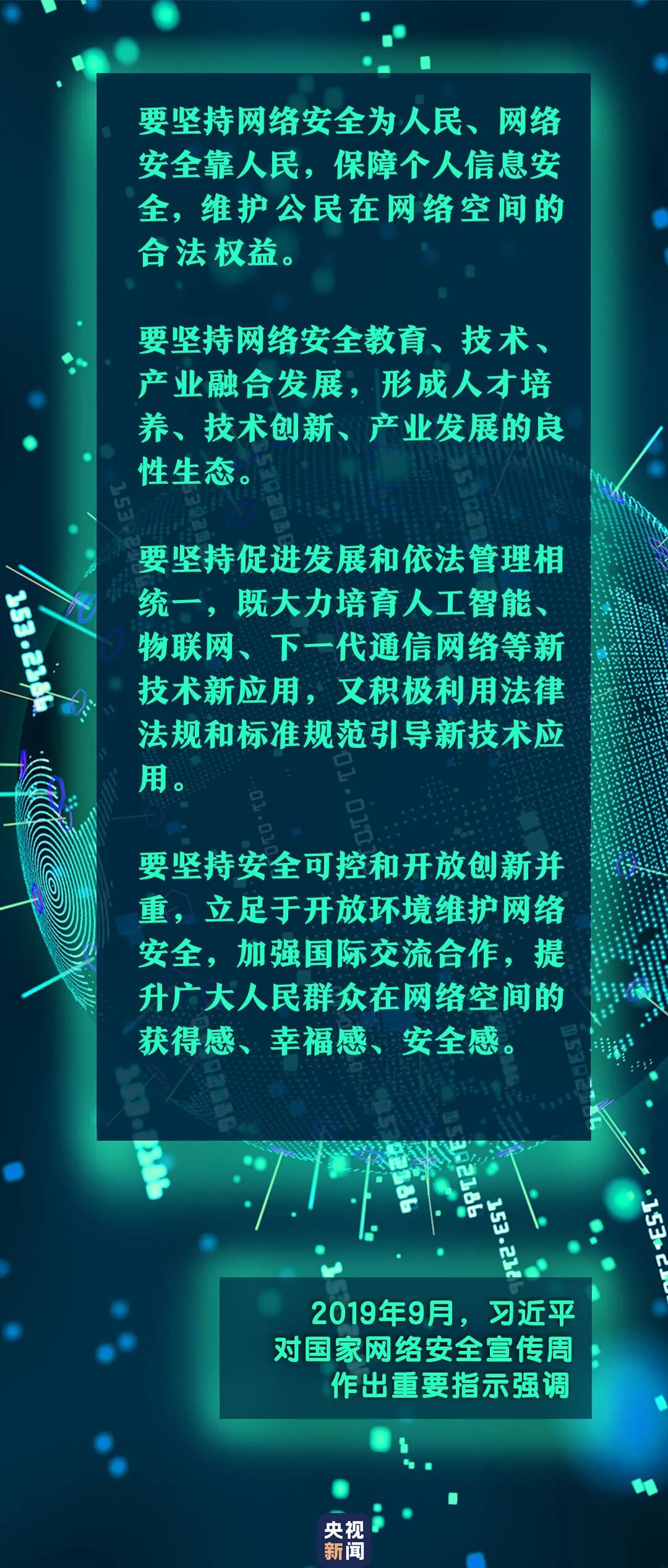 “举办网络安全宣传周、提升全民网络安全意识和技能,是国家网络安全工作的重要内容。”一年前,习近平总书记对2019年国家网络安全宣传周作出重要指示强调。 2018年4月20日至21日,全国网络安全和信息化工作会议在北京召开。习近平出席会议并发表重要讲话。 “没有网络安全就没有国家安全,就没有经济社会稳定运行,广大人民群众利益也难以得到保障。”习近平总书记高度重视网络安全工作,在部署建设网络强国时,多次强调要建设风清气正网络空间、共筑网络安全防线,“让互联网更好造福人民”。 一个安全稳定繁荣的网络空间,对各国乃至世界都具有重大意义。 习近平强调,要树立正确的网络安全观,加快构建关键信息基础设施安全保障体系,全天候全方位感知网络安全态势,增强网络安全防御能力和威慑能力。 为共筑网络安全屏障,我国多措并举、多管齐下,成效显著。 2014年,中央网络安全和信息化领导小组成立,集中统一领导全国互联网工作。 2016年12月,《国家网络空间安全战略》发布,确立了网络安全的战略目标、战略原则、战略任务。 2017年6月1日,我国网络安全领域首部基础性、框架性、综合性法律《中华人民共和国网络安全法》正式施行…… 2020年国家网络安全宣传周郑州线下场馆。 国家网络安全宣传周自2014年起每年举办一次,通过开展网络安全进社区、进校园、进军营等活动,有效提升了全民网络安全意识和防护技能,“网络安全为人民,网络安全靠人民”的理念深入人心。 今年网络安全宣传周的数字化展会,首次通过虚拟展馆在线上举行,综合运用3D建模、H5、直播等技术,向全国受众展示网络安全领域重大成就、前沿技术和最新产品。 网络空间是亿万民众共同的精神家园。网络空间天朗气清、生态良好,符合人民利益。 “我们要本着对社会负责、对人民负责的态度,依法加强网络空间治理,加强网络内容建设,做强网上正面宣传,培育积极健康、向上向善的网络文化。”习近平对加强网络空间治理提出了明确要求。 2020年5月26日,安徽省淮北市公安局相山公安分局三堤口派出所民警向小区居民讲解电信诈骗防范常识。 组织开展移动互联网应用(App)违法违规收集使用个人信息专项治理,对存在严重问题的App采取约谈、公开曝光、下架等处罚措施……近年来,国家主管部门协同发力,对当前社交媒体及网络视频平台上存在的违法违规行为打出一系列“组合重拳”;相关部门持续开展“净网”“剑网”“清源”“护苗”等系列专项治理行动,网络谣言、网络色情等乱象得到有效整治。 众志成城齐战“疫”,守望相助暖人心。越来越多的正能量通过网络传播,网络空间日益成为亿万民众共同的精神家园。 2016年4月19日,习近平总书记在网络安全和信息化工作座谈会上作了明确回答,“要适应人民期待和需求,加快信息化服务普及,降低应用成本,为老百姓提供用得上、用得起、用得好的信息服务,让亿万人民在共享互联网发展成果上有更多获得感”。 我国经济发展进入新常态,新常态要有新动力,互联网在这方面大有作为。现在,互联网越来越成为人们学习、工作、生活的新空间,越来越成为获取公共服务的新平台。 今年4月20日,习近平在陕西考察时来到地处秦岭深处的柞水县小岭镇金米村。在村培训中心,几位村民正在做网上直播卖货的准备工作,总书记走到直播平台前,同他们亲切交谈起来。他表示,电商作为新兴业态,既可以推销农副产品、帮助群众脱贫致富,又可以推动乡村振兴,是大有可为的。 2020年4月21日,陕西柞水县小岭镇金米村,“90后”主播李旭瑛正在网上直播卖木耳。 截至2019年10月,我国行政村通光纤和通4G比例均超过98%,贫困村通宽带比例达到99%,实现了全球领先的农村网络覆盖。农村及偏远地区学校网络接入条件不断改善,全国中小学校联网率超过96%,助力实现教育均等化,为网络扶贫奠定坚实基础。 越来越多的农产品依靠互联网走出乡村,大山深处的孩子通过互联网接受更优质的教育……互联网不仅带动新业态,也在脱贫攻坚中发挥着重要作用。 网络安全和信息化事关国家安全和国家发展、事关广大人民群众工作生活。我们要牢记习近平总书记的嘱托,加强网络空间治理,维护网络安全,让互联网更好造福国家和人民。