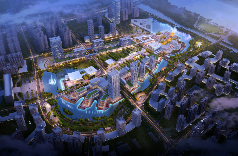 △今年年底前完成会议展览中心、体育综合体、图书综合体主体工程封顶及东洲坝岛水利景观工程,力争今年活力区初现雏形。图为中央活力区设计效果图。