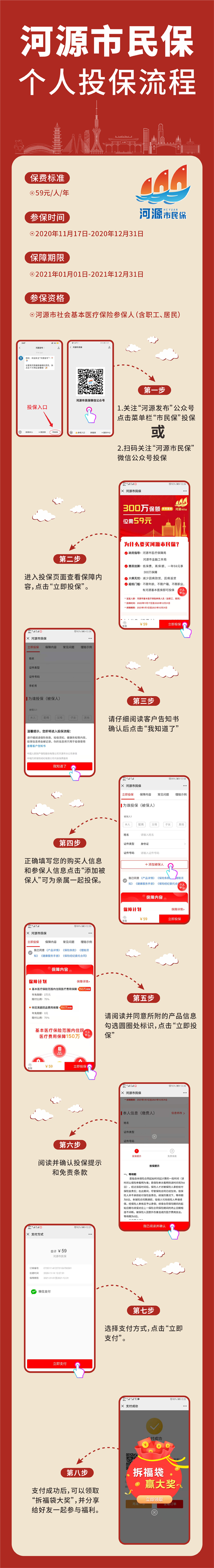 “河源市民保” 今天上线啦! 自2015年深圳市率先推出 普惠型补充医疗保险-深圳重疾险以来 如今在全国50多个城市已相继上线 广东省内就有10个城市 现在!终于! 河源人民不用再羡慕其他城市 河源首个普惠型补充医疗保险 “河源市民保” 11月17日0点正式开缴! “河源市民保”是河源首个普惠型补充医疗保险,与河源市基本医疗保障体系可以形成有效互补,对完善河源多层次医疗保障体系具有重要意义,是补齐河源市医疗保障体系最后一环的有益尝试。 该险种具有“惠民工程、老少同价、特药可报”的特点,不限年龄、不限职业、无需体检、没有等待期,只要是河源市基本医疗保险参保人,都可以投保。无论老少一年仅需59元,可获得基本医疗保险范围内住院医疗费用最高150万、20种特定高额药品费用最高150万保障,同时还提供特药直付等8项健康服务。 河源市全体居民请注意,在风险面前,切勿抱有侥幸心理,认为医疗保险毫无用处。当疾病发生时,巨额的医疗费用会极大的加大多数家庭的经济压力,甚至压垮大多数家庭。等到手足无措想要投保时,才发现为时已晚。 59元保一年,最高保障300万! 参保时间:2020年11月17日—2020年12月31日 保障期限:2021年1月1日—2021年12月31日 广大河源市民切勿错过投保日期! 点击下图全屏查看大图
