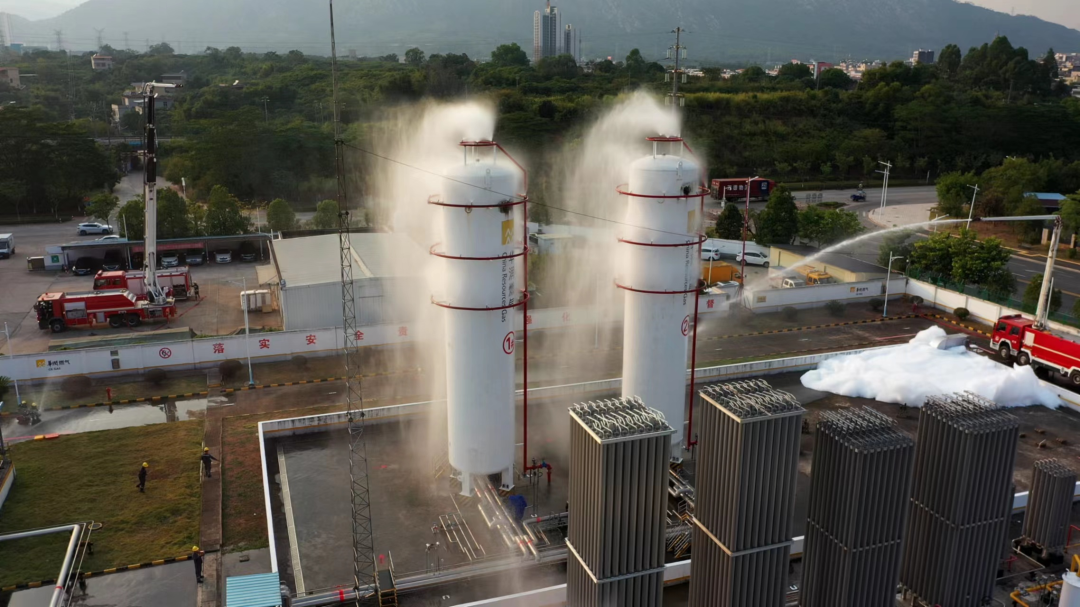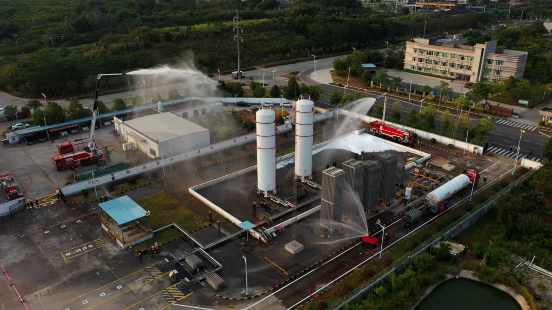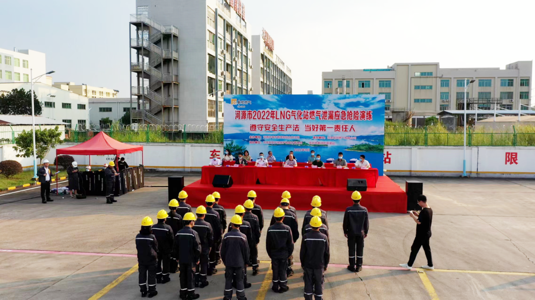 本次模拟演练情景设定为河源华润燃气有限公司高新区LNG气化站储罐出液紧急切断阀出现泄漏险情,险情出现后,河源华润燃气迅速启动燃气突发事件应急预案,联合应急、消防等工作人员立即开展救援工作。