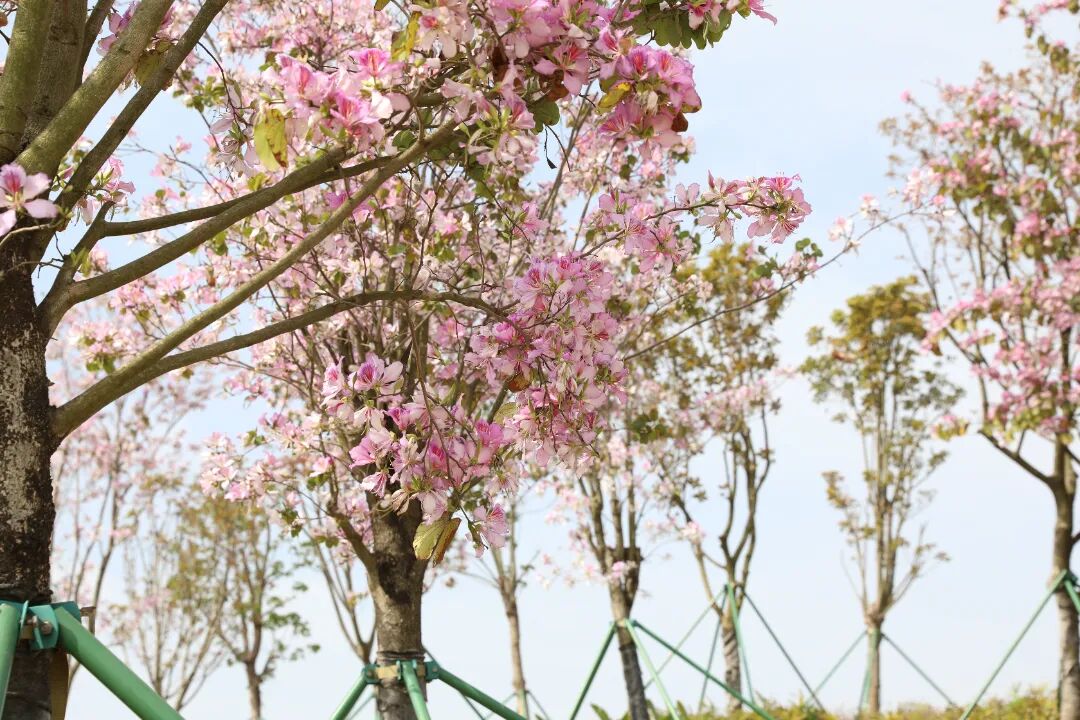 在高新区,宫粉紫荆贡献一抹又一抹浪漫粉,芦苇丛中芦苇草随风摇曳,黄花风铃木给人满目金黄,紫花鼠尾草开出一片紫色花团,处处鲜花盛开。