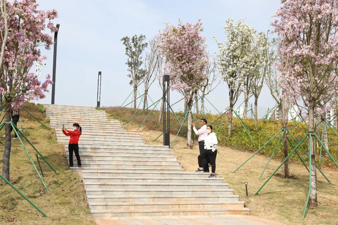 进入高新区,滨水公园、江滩公园、白鹭岛公园,组成了十里东江生态滨水景观公园,各色花朵与高低绿植掩映成趣。绿叶红花,游人信步,绘出一幅春日画卷,觅得一分写意,这都是属于春天的浪漫。