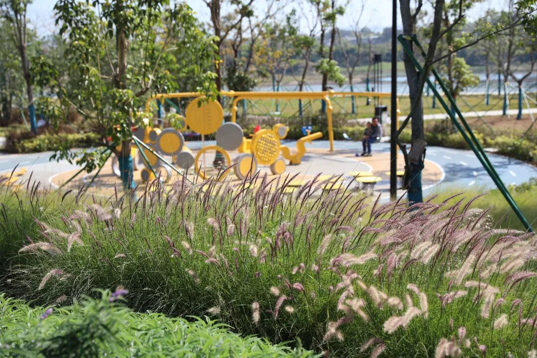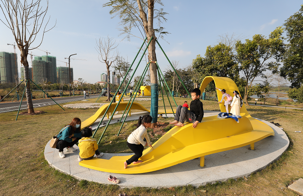 近年来,河源国家高新区坚持绿色发展理念,厚植绿色底蕴,打造了十里东江生态滨水公园,对园区道路实施亮化绿化美化景观工程,并根据宜居生活的需求,配套建设了儿童游乐设施、运动健身场所、休闲娱乐等公共空间。