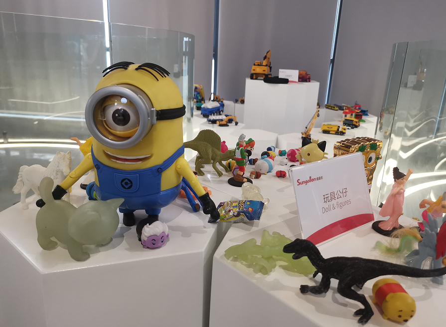 盛嘉伦河源公司的核心业务是热塑性弹性体(TPE)材料的生产研发,产品在下游市场的应用非常广泛,如应用于家用电器、玩具文具、汽车、建筑等各个领域。在盛嘉伦河源公司的产品展厅中,记者看到了使用热塑性橡胶材料的各类产品,如橡皮擦、笔等文具产品;挖掘机、恐龙、“小黄人”公仔等玩具产品;充电线等3C消费电子产品;密封边条等建筑行业产品,以及共享单车等日用品。