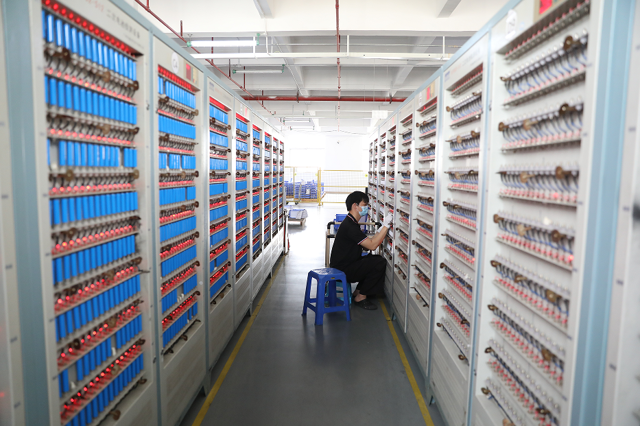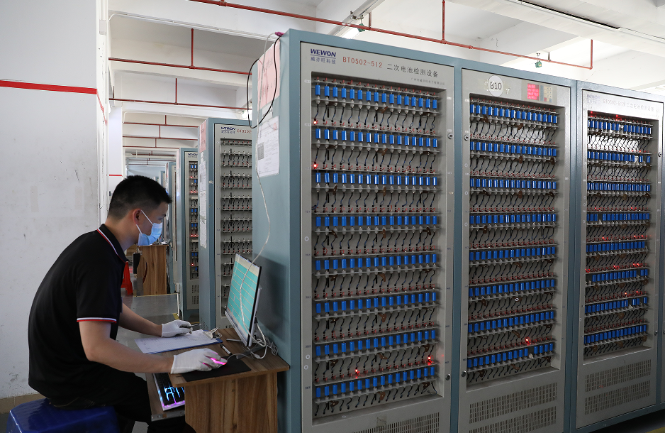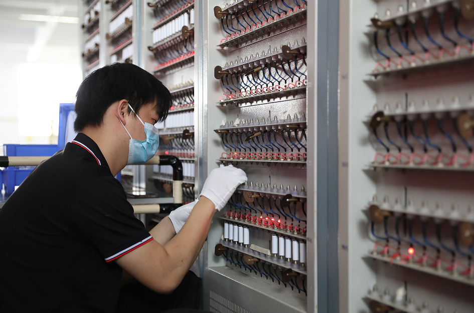 在强芯能源公司的生产车间,记者看到,成千上万只锂电池,被安装在一排排检测柜内,蓝色的锂电池在红色的指示灯闪烁中,接受着设备的检测。有员工往检测柜中装电池,有员工认真查看设备运行和数据分析情况。他们要保证每一只锂电池都要进行“体检”,且达标后才能出厂。此外,在不同的车间,工人操作着涂布机、对辊机、电池极片轧制设备等各式设备,实现了产线分段式自动化。