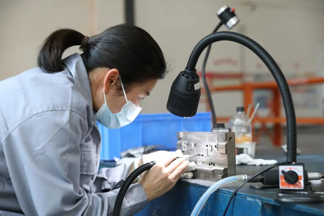 走进河源恒大模具的生产车间,宽敞的车间内排列着多台数控加工中心和电火花加工机、精雕机,各个工序的技术工人或操作机器、或打磨模具,完成加工的模具零件被整齐放上物料架。