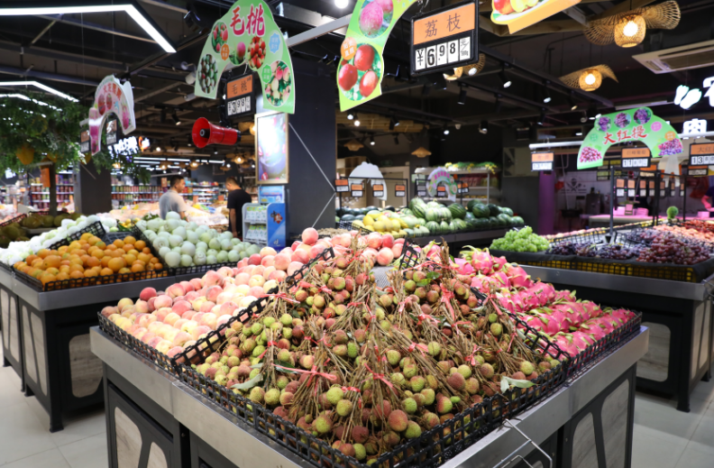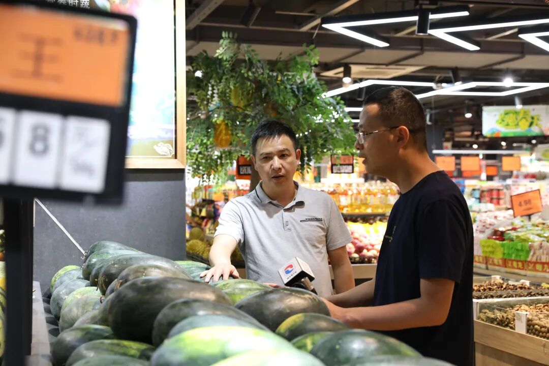 食品是群众消费频次最高的品类,因此,为了突出河源特色,张宇生在采购本地产品方面也颇为用心。他们与肉联厂、农业合作社或农户进行合作,采购本地优质产品,包括销售的大部分鸡鸭鹅猪肉等肉类,以及部分应季的蔬菜水果。采访当天,他们从紫金县义容镇采购的黑美人西瓜非常畅销。张宇生介绍,义容镇黑美人西瓜皮薄清甜口感好,进入夏季以来,每天能销售1000斤左右。