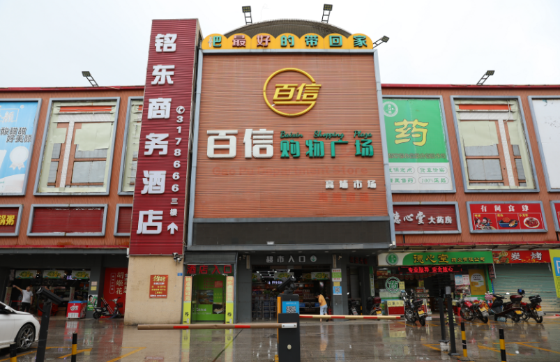 在河源国家高新区龙记模具厂旁边的高埔村龙记市场,是周边企业员工和本地村民生活较为集中的片区。百信购物广场是开在这里的一家购物超市,以满足周边市区群众日常生活消费需求。