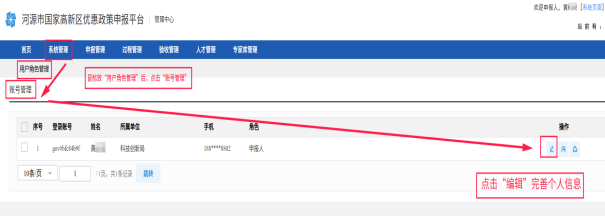 4.登录后,需完善个人信息,点击:系统管理→用户角色管理→账号管理,再点击右侧操作栏下方的“编辑”按钮,进入个人信息编辑页面。