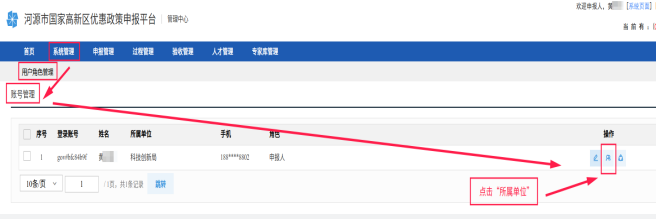 6.填完以上几步内容,再回到:系统管理→用户角色管理→账号管理,点击以下图表选择“所属单位”。(提示:如果出现“请联系单位管理员完善单位信息”,可在此步骤点击“退出单位”,再重新申请加入单位“未找到单位”)