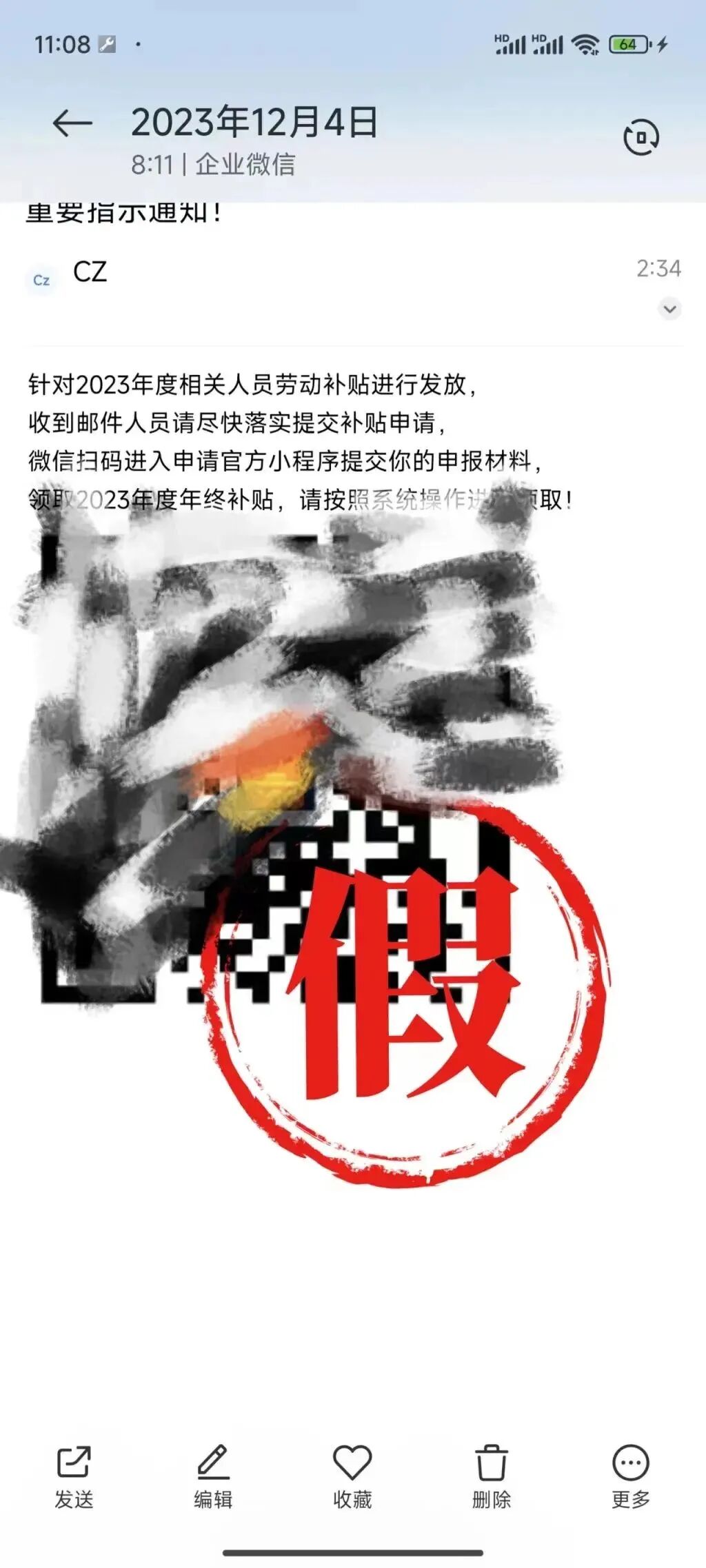 “扫码登录网站领取补贴”的邮件