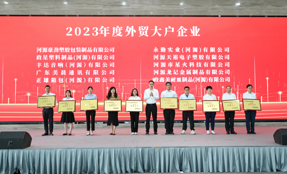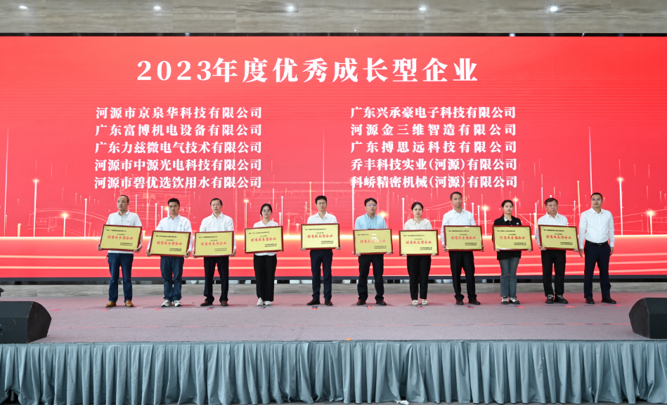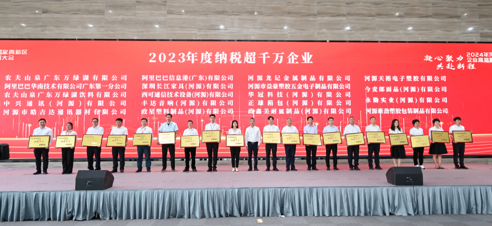 企业强,则产业强、经济强。大会上,河源国家高新区为2023年度优秀示范企业、省专精特新企业、“国家绿色工厂”称号企业等优秀企业颁奖表彰,感谢各企业在促进就业、产业兴市、经济增长、扶贫济困等各方面作出重要贡献。农夫山泉广东万绿湖有限公司、中兴通讯(河源)有限公司等19家企业获评纳税超千万企业,河源市艾佛光通科技有限公司、广东九明制药有限公司等10家企业获评科技创新示范企业。