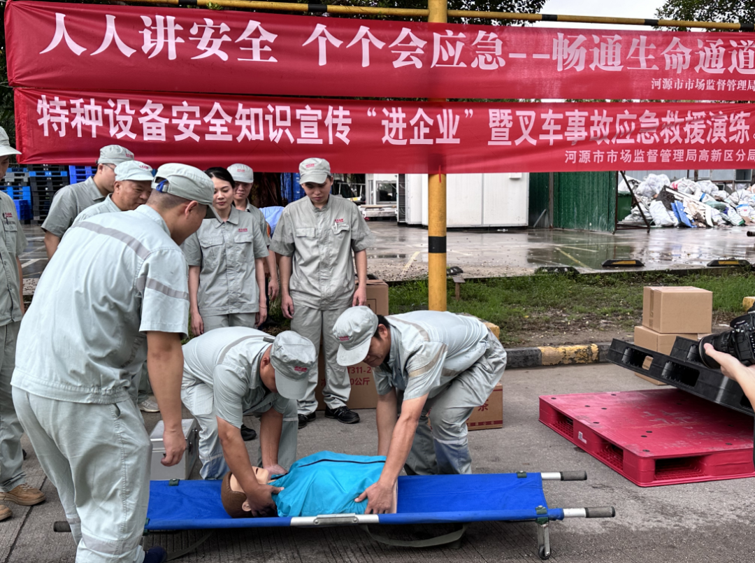 近日,河源市市场监督管理局高新区分局联合河源市市场监督管理局、广东省特种设备检测研究院河源检测院、农夫山泉广东万绿湖有限公司,在高新区农夫山泉广东万绿湖有限公司厂区内开展以“人人讲安全 个个会应急——畅通生命通道”为主题的特种设备安全知识宣传“进企业”暨叉车应急救援演练活动。
