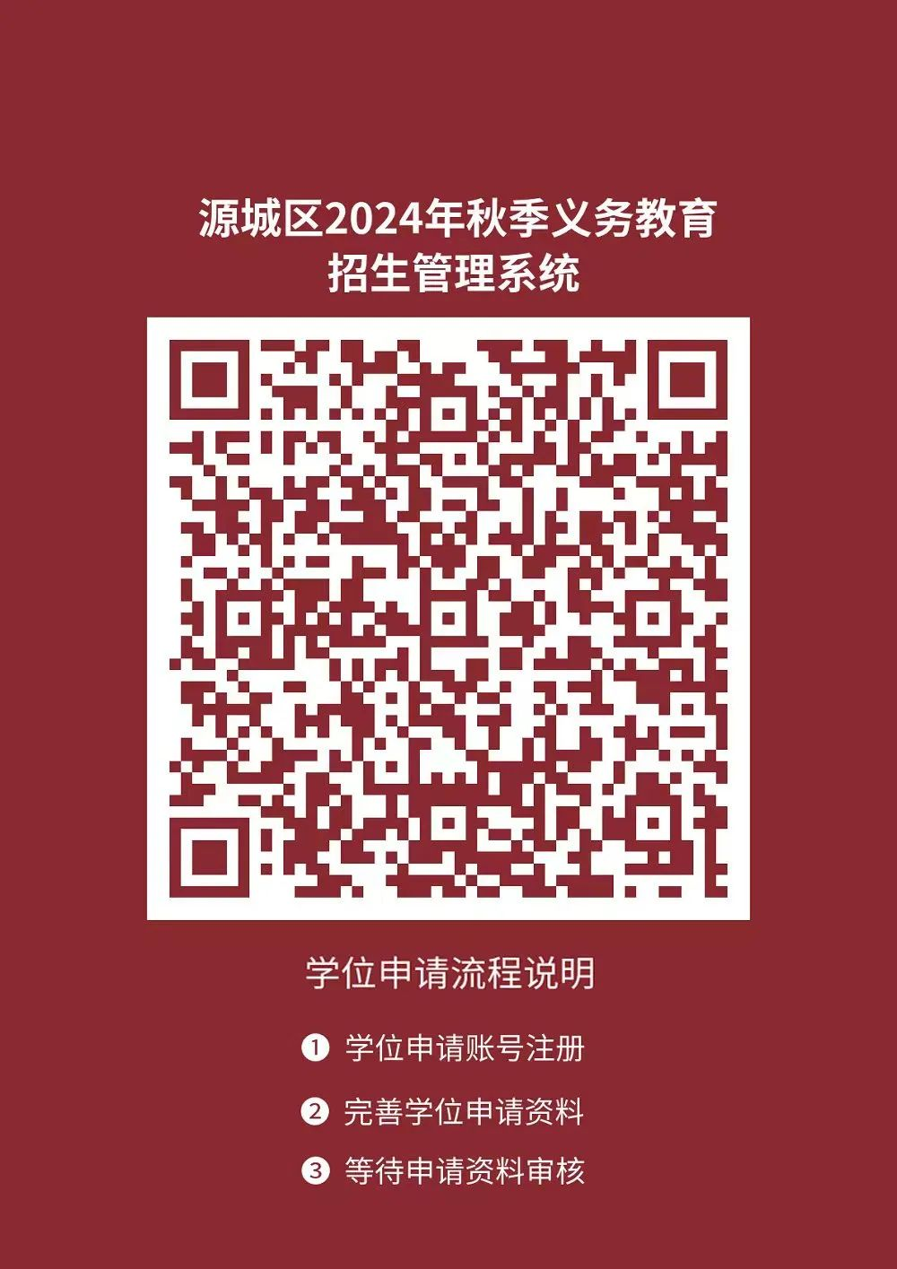 1.注册信息:扫描下面二维码,登录“源城区义务教育招生管理系统”(以下简称“招生系统”),按照招生系统要求完成在线注册(可通过招生系统内的“操作指引”了解招生系统的申报流程)。