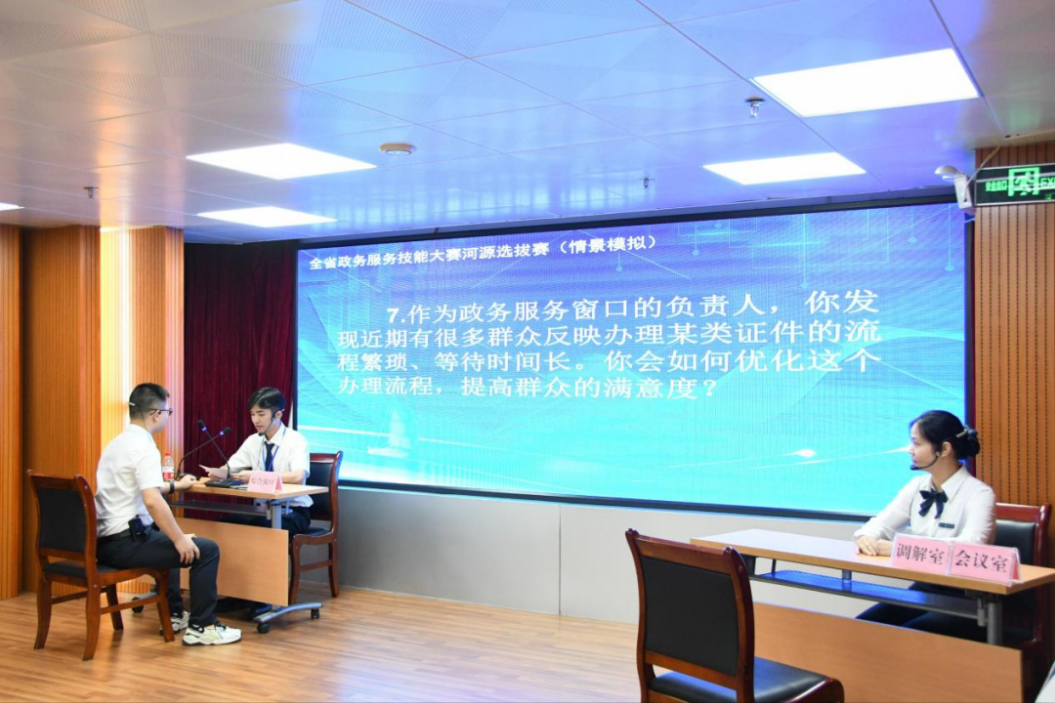 据悉,本次比赛以“理论笔试+技能实操”形式进行,设置了政治理论、政策法规、业务技能、管理规范等四大类知识题目,涵盖习近平新时代中国特色社会主义思想、政务服务标准、数字化改革、营商环境优化提升、政务服务礼仪、政务服务平台应用等内容。有来自市级28个部门、各县(区)政务服务和数据管理局共71名选手、11支队伍进行激烈角逐,河源国家高新区政务服务代表队由市场监管、税务、政数3个部门联合组成参赛队。