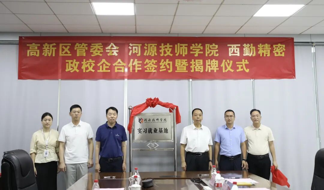 27日,河源市高新区管委会、广东省西勤精密模具有限公司(以下简称“西勤公司”)与河源技师学院在西勤公司举行政校企合作签约暨揭牌仪式。活动旨在进一步提升政府、企业和学校之间的合作与交流,推动职业院校和企业双向选择、资源共享、优势互补,促进校企就业联动,提升人才培养质量,为河源产业高质量发展注入人才活力和创新动力,助力“百千万工程”。