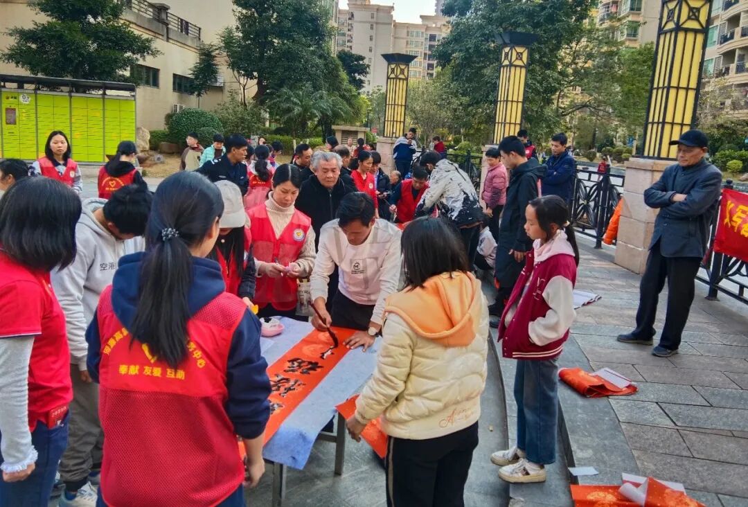 1月20日下午,河源高新区弘爱志愿者服务中心工会驿站在香堤雅湾东门开展义写春联“墨香四溢传古韵,志愿之心送温暖”活动。