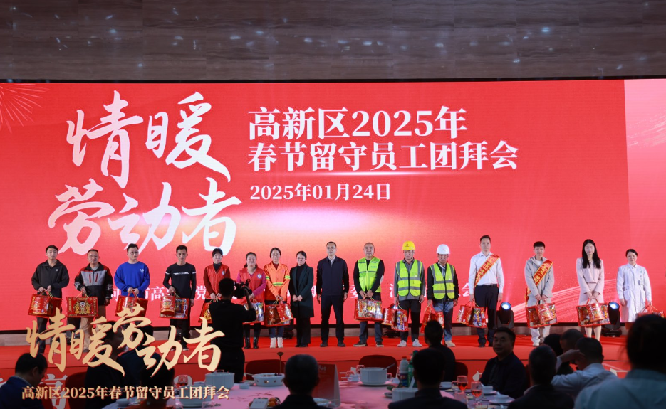 24日晚,“情暖劳动者”高新区2025年春节留守员工团拜会,在高新区国际会议中心举行。场馆内气氛热烈、喜气洋洋,高新区领导与园区400余名企业留守员工欢聚一堂,共同分享一年来的收获与喜悦,一同庆祝新春佳节的到来。高新区党工委书记骆世文,党工委副书记、管委会主任陈志中,市总工会党组成员、副主席黄燕霞,高新区全体班子成员等出席活动。