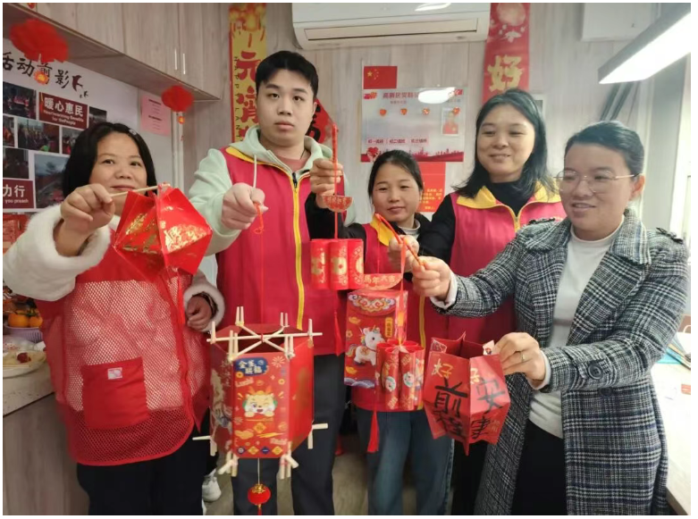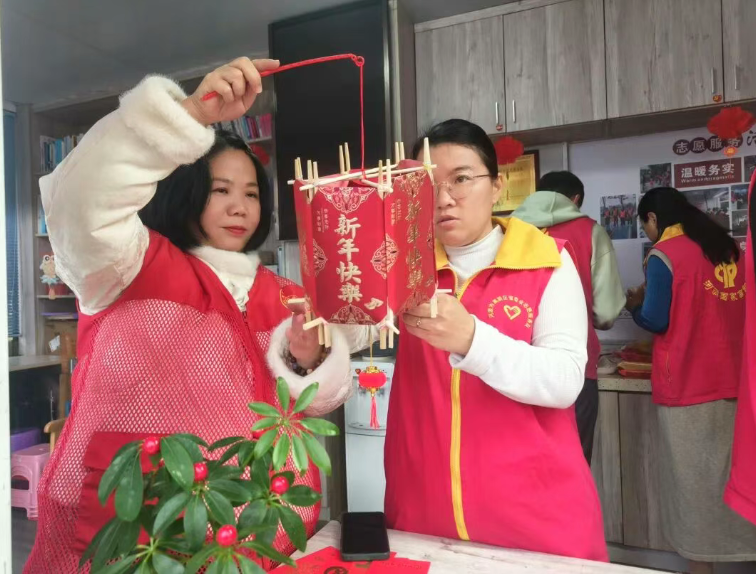 活动现场,志愿者们仿照客家花灯样式,将一次性筷子嵌入红包皮中,不一会儿,一盏盏形似客家花灯的灯笼便制作完成。经过两个多小时的努力,一盏盏小灯笼与驿站内的福字、对联相映成趣,将简约的驿站装点得格外红火热闹,整个空间洋溢着浓厚的节日氛围与家的温暖。